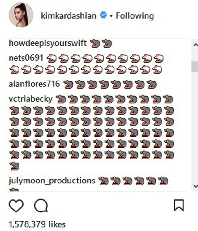 A történethez még az is hozzátartozik, hogy amikor Taylor bejelentette új albumának, a Reputationnek a megjelenését a Kardashian-West rajongók elárasztották kígyó emojikkal az Instagramját annak jeléül, hogy egy hátba vágó, rosszindulatú kígyó – véleményük szerint. Most pedig Kim fotóját trollkodik szét patkány emojikkal a Swift fanok, mert szerintünk meg Kim az, aki egy undorító patkány. Nos, erről csak annyit, hogy a kígyó megeszi a patkányt, a patkány viszont ha úgy adódik megeszi a kígyót is...