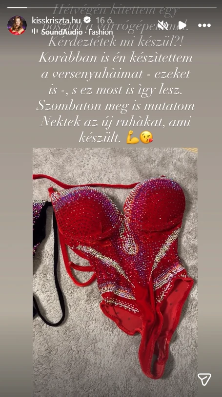 Instagram-storyban mutatta meg Kiss Kriszta korábbi versenyruháit, amit a fitneszversenyeken viselt. Kiderült, mindegyiket ő varrta, és az utóbbi hetekben is így tett: a saját maga által megálmodott szettet fogja viselni hétvégén.