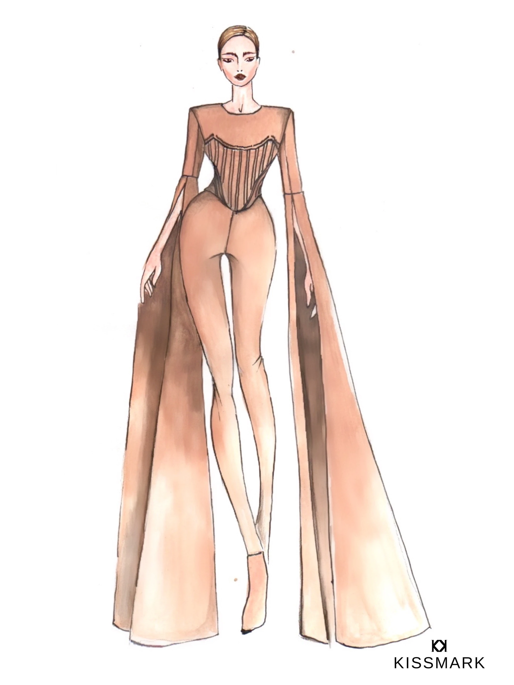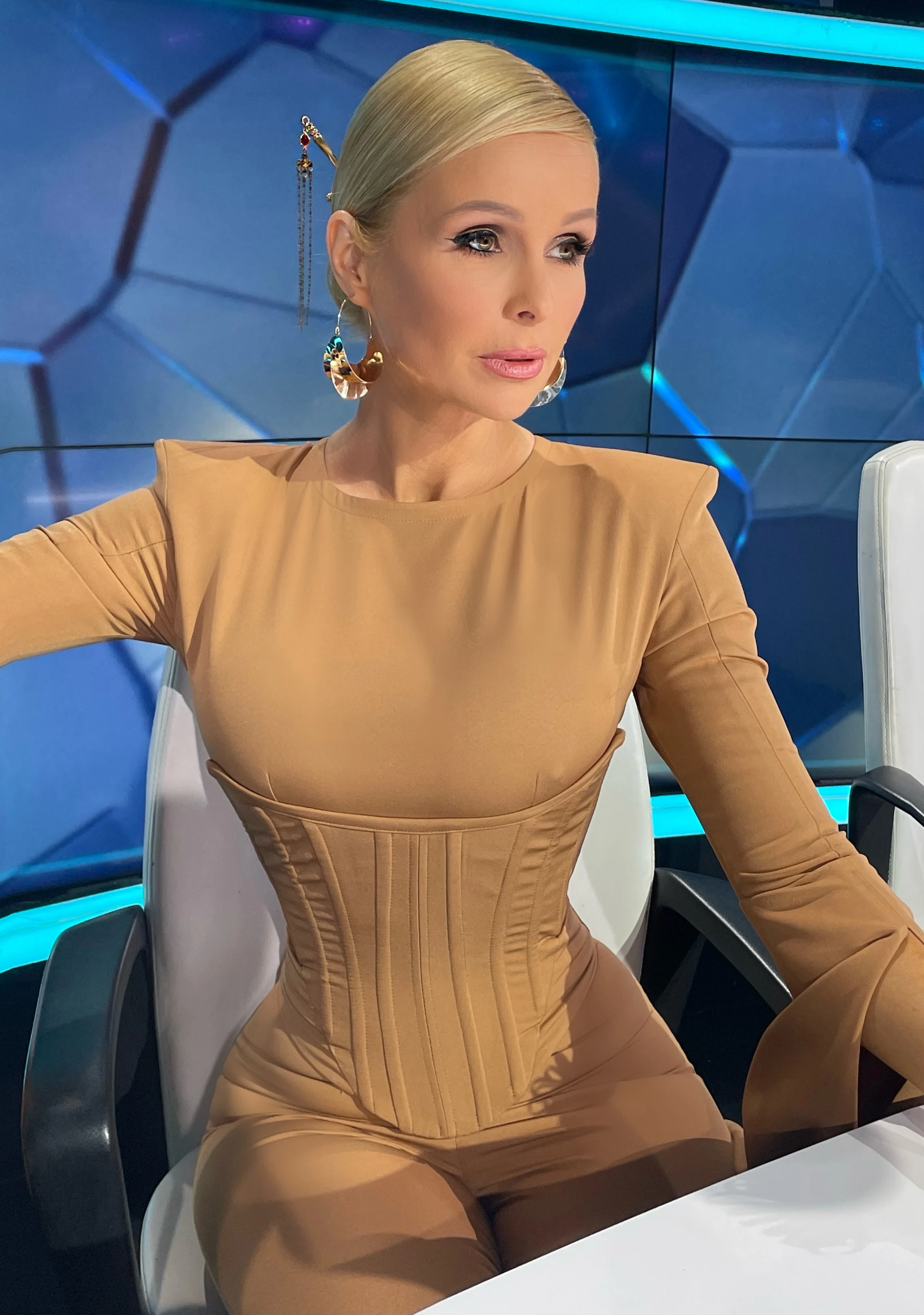Úgy döntöttem hát, hogy egy teljesen testhez álló outfit lesz az, amiben jól láthatóvá válnak az idomai. A nagyon karcsú derekat pedig egy nagyon feszes, masszív tartású fűzővel kreáltuk, ami extrémen vékonnyá tette az amúgy is karcsú derekát. A fűzőt többszörösen beragasztottuk vetexszel, és fémhalcsonttal merevítettük. Természetesen egyeztettünk, felpróbáltuk, kipróbáltuk, mi az a határ, amit kibír a fűzőben. Az ezt firtató kérdésemre az volt egyébként a válasza: »ármennyit kibírok!«” – mesélte Márk.