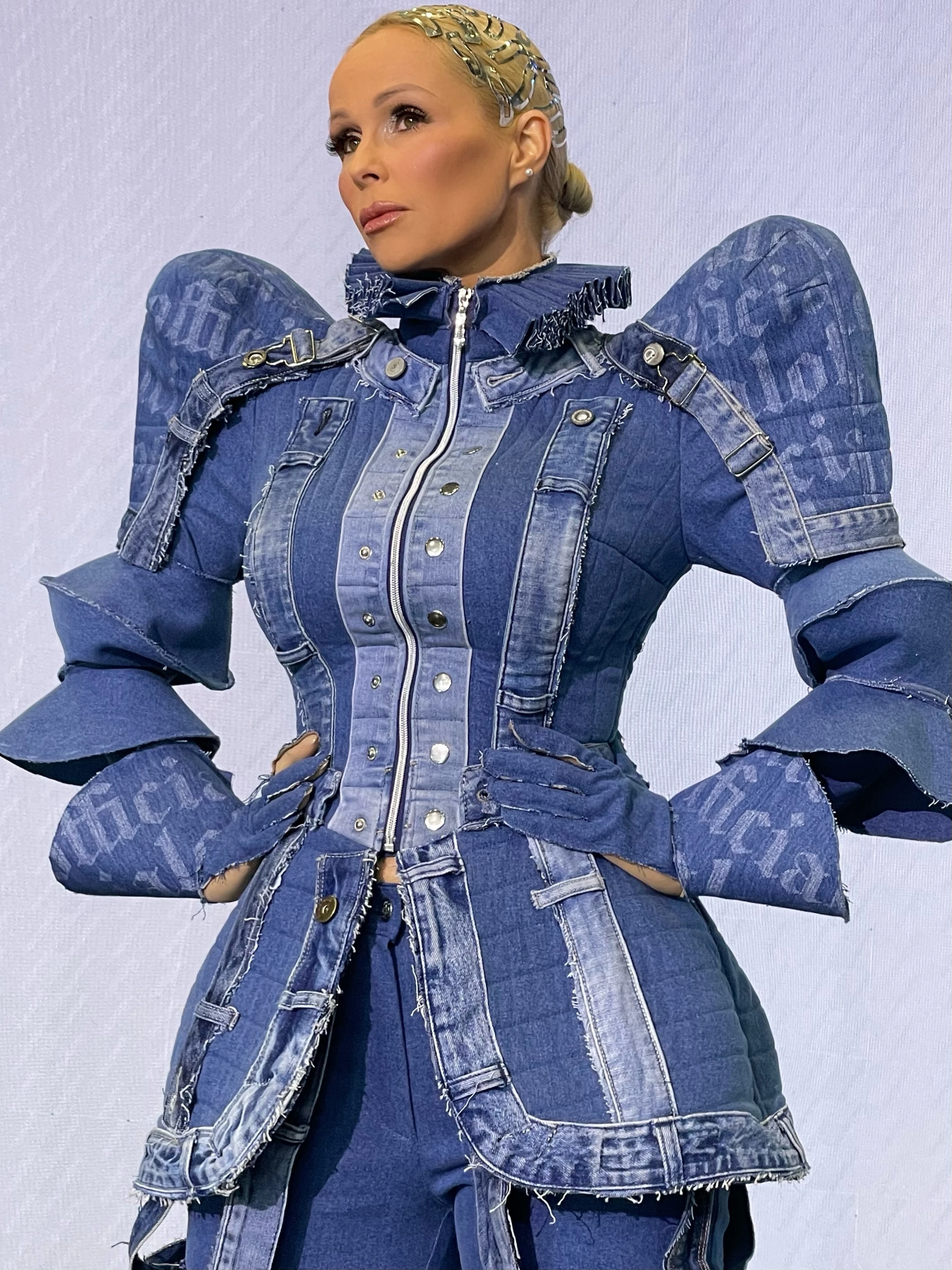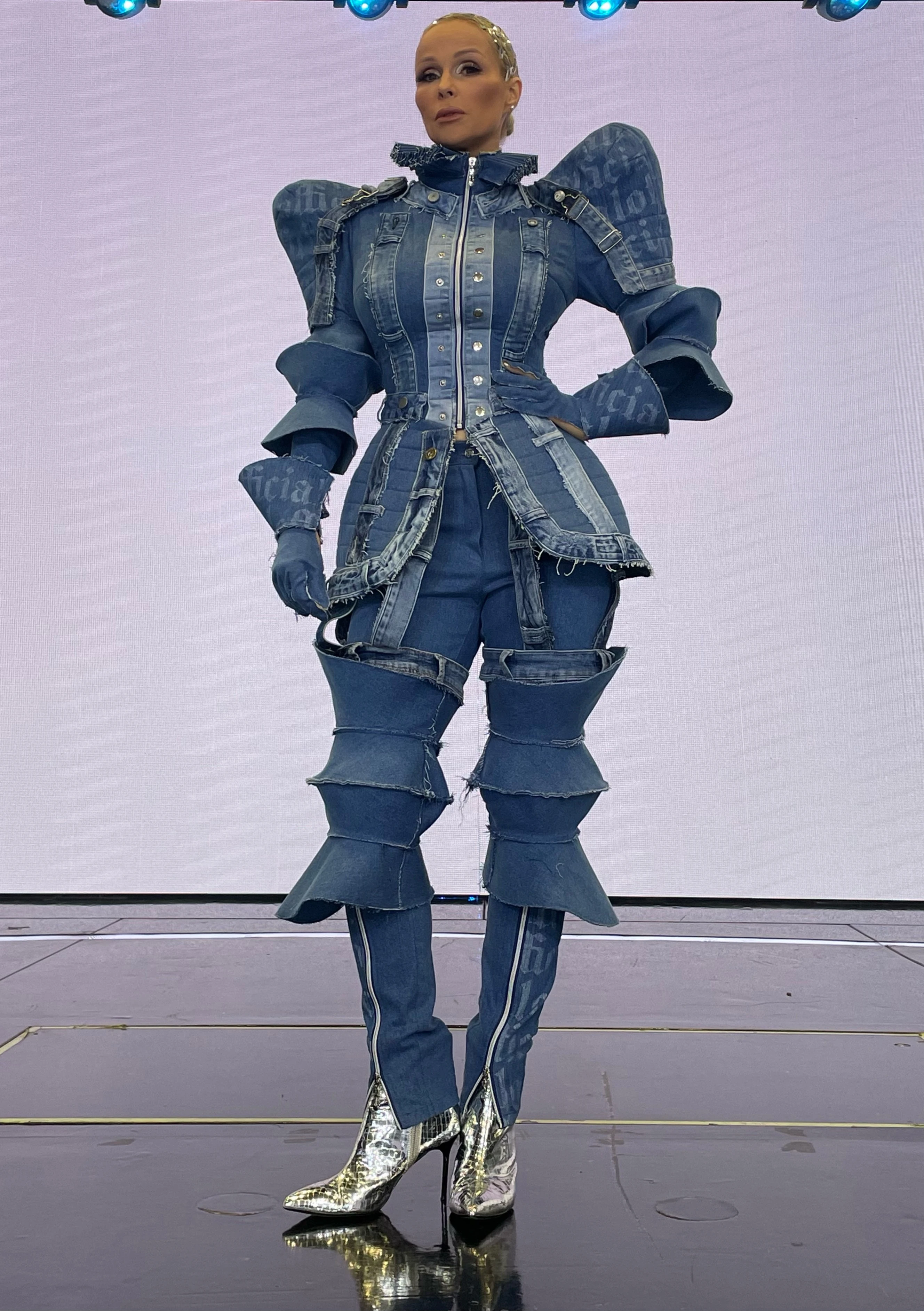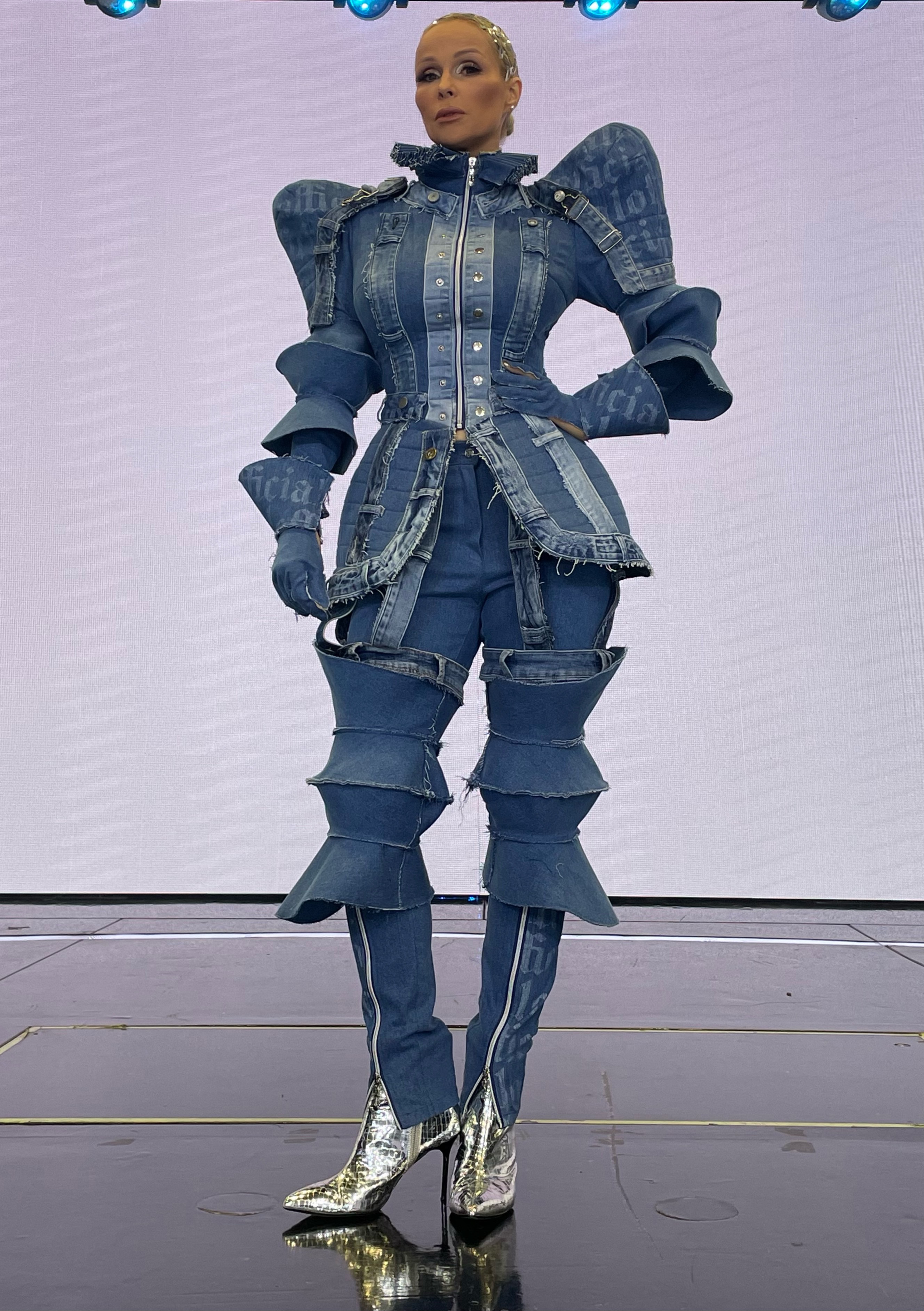 Babett kilencedik élő adásos ruháját a spanyol reneszánsz festészet inspirálta, azon belül is a férfiportrék hatottak Kiss Márk stylist képzeletére. A lovagi, páncélos öltözetek elemeit gondoltam újra, és készítettük el modernebb verzióban. A ruha alapanyaga farmer lett. Ezt a nagyon tartós alapanyagot merevítettük szivacsokkal, ettől páncélos, kemény hatása lett. A famereket egyébként turkálókban szereztem be, és minél többféle színárnyalatot szerettem volna kombinálni.