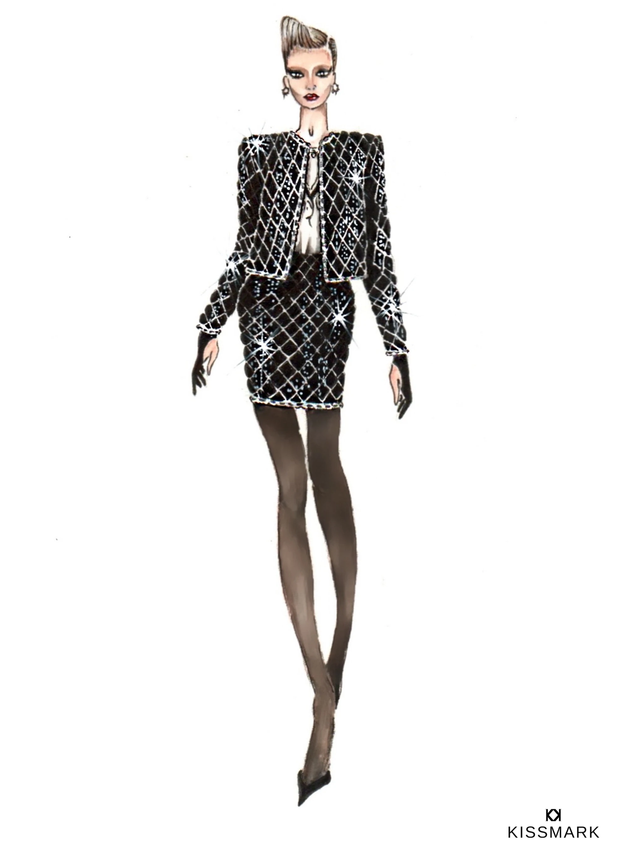 Egy fekete flitteres alapanyagból indultak ki, melynek a tartását az adja, hogy a klasszikus Chanel táskák mintája alapján saját maguk steppelték, és a flitterek és a bélés közt egy réteg fríz bélésanyag van. A flitter különleges csillogása hihetetlenül látványossá teszi a klasszikus, konzervatívabb formát. A kosztüm szegélyeit ezüstlánc díszíti (ami a Chanel kosztümökre jellemző), ezt bőr szalaggal fűzte át a stylist. A decens kiskoszüm-hangulatot azért oldani szerette volna valamivel, így a punk-stílusból vett átt elemeket, ezt csempészte az öltözékbe az alkotó.
