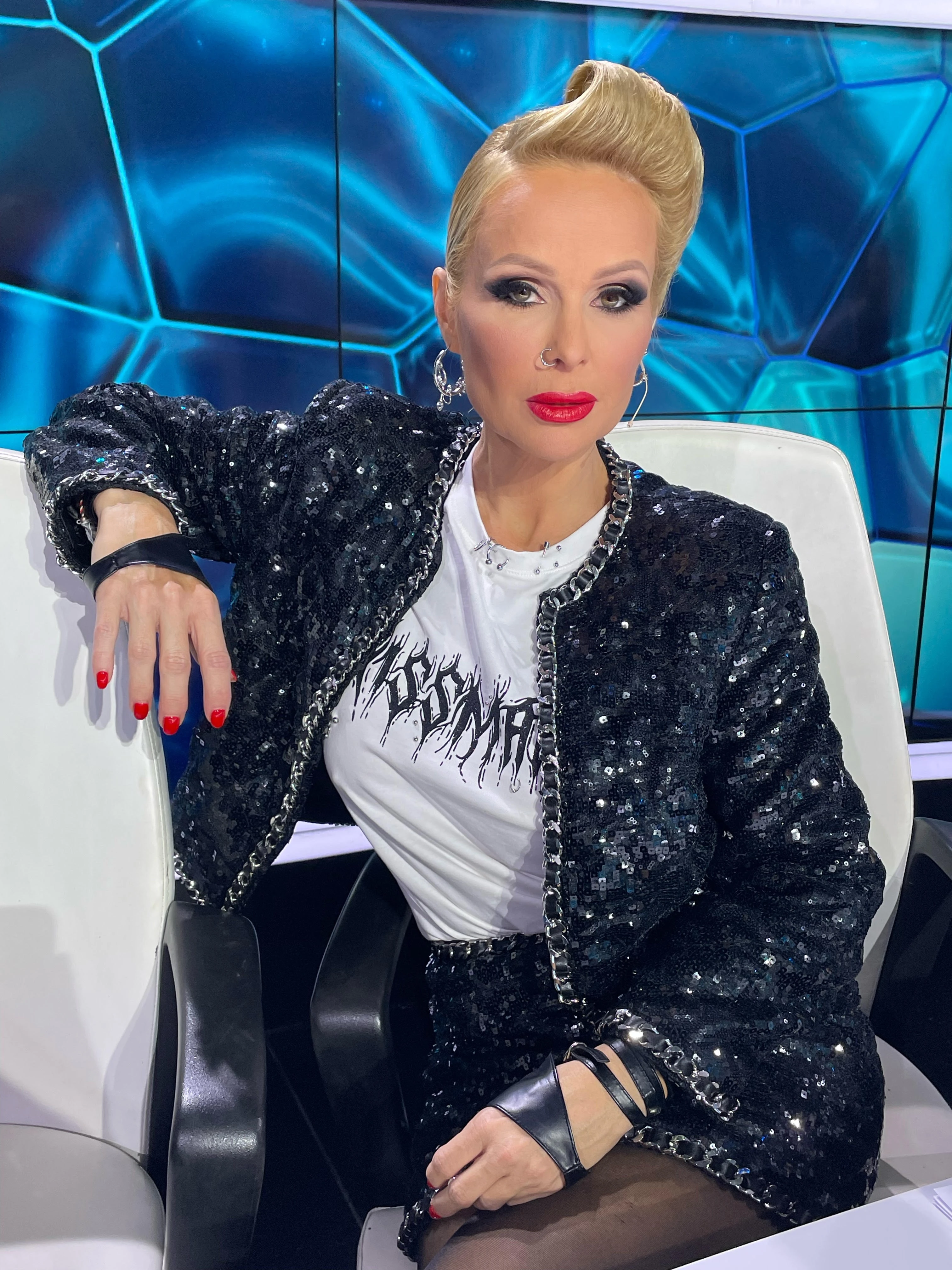 Egy lezser fehér pólót készítettek a kosztümhöz, melynek a grafikáját Kiss Márk készítette, majd nyomtattatta rá a pólóra, amit szegecsek helyett piercingekkel díszített. „Ehhez az öltözékhez elengedhetetlen volt számomra a 80-as évek handulatát idéző, enyhén áttetsző fekete harisnya és a hegyes orrú, lakk magas sarkú cipő. A beautyrészlegről egy erőteljesebb, punkosabb sminket és egy szintén a 80-as évekre jellemző befésült, férfias stílusú frizurát kértem.” – foglalta össze Köllő Babett megjelenésének a leírását a divattervező.