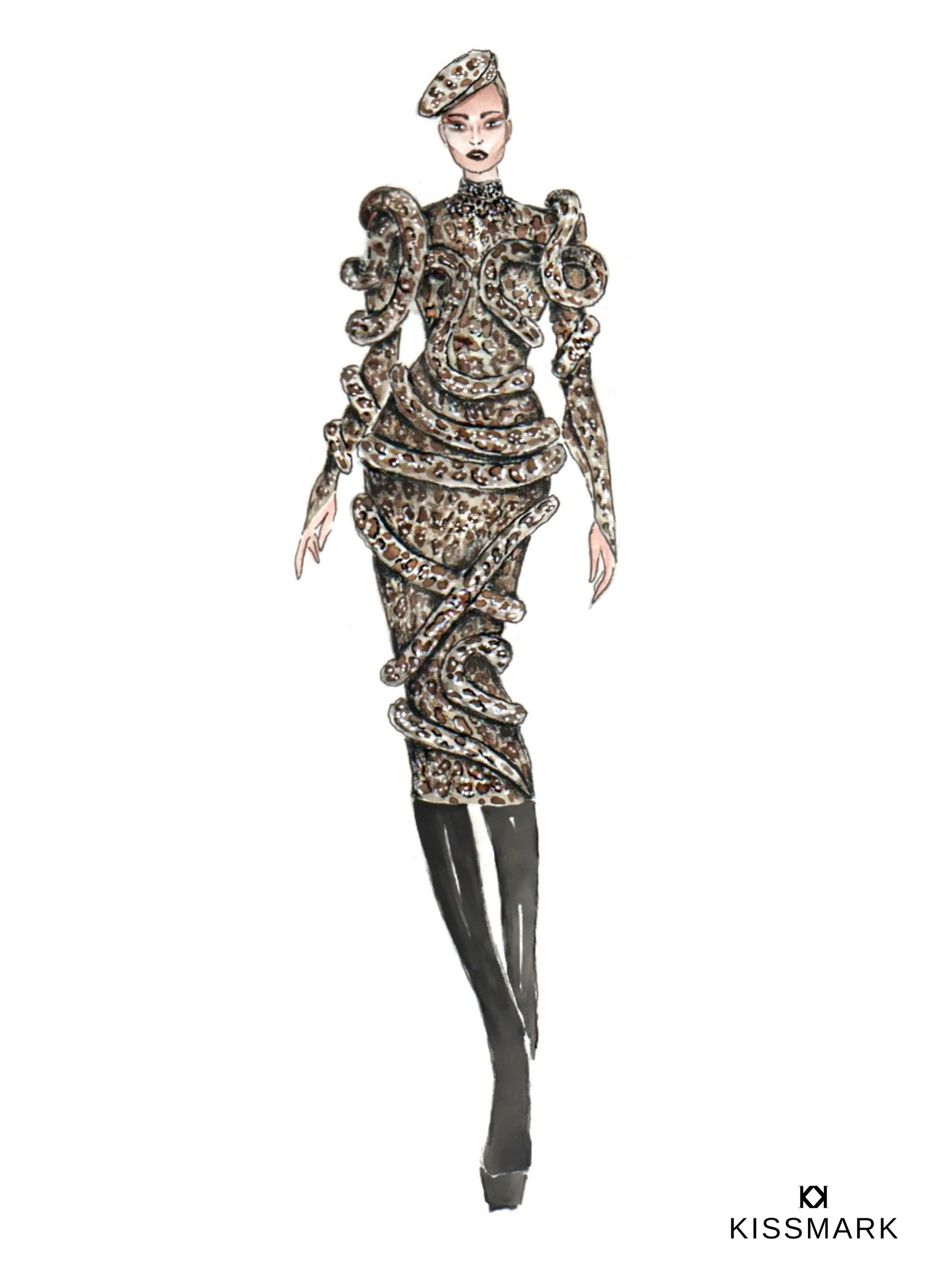 „A ruha inspirációja két dologból tevődött össze, az egyik az a tény, hogy volt egy elmaradt produkciónk, aminek megmaradt az anyaga, és szerettem volna ezt jól felhasználni. Ez egy kígyómintás műbőr. A kígyókból kiindulva eszembe jutottak a kígyós istennő szobrok a krétai kultúrából, és ahogyan tanulmányoztam ezeket a kis szobrocskákat, az egyiken a figura testén futottak a kígyók, rátekeredtek. Ez volt a kiindulópontom. Az alapruha egy szűk, testre feszülős, garbós ruhadarab, ezen, saját anyagából elkészítve fotnak körbe-körbe, tekerednek a 'kígyók'. Mivel az anyag nyomata eléggé élethű, ezért az általunk kialakított, megvarrt kígyók is meglehetősen élethűek.” – mesélte Kiss Márk divattervező, stylist.