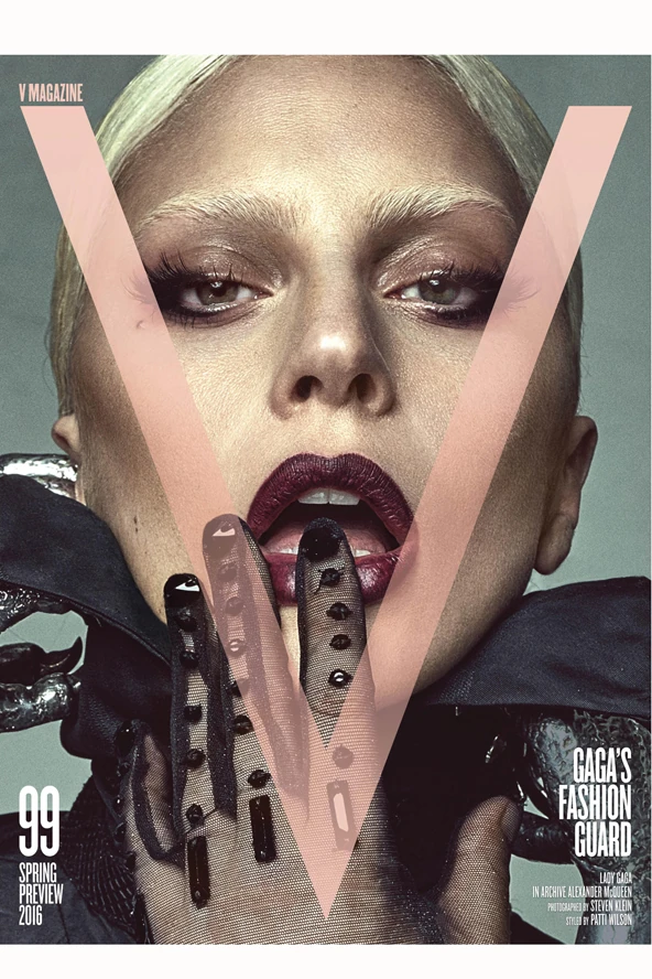 A 99. V magazin vendégszerkesztője Lady Gaga, aki nem tétlenkedett, összesen 16 borítót készített a stílus és divatmagazin számára. Természetesen ebből a legtöbben ő maga szerepel, de kerültek olyanok is a címlapokra többek között, mint Karl Lagerfeld, Daphne Guinness, Hedi Slimane vagy az egykori tervező zseni, Alexander McQueen, illetve az énekesnő és a színész francia bulldogja, Asia is vendégszerepel egy sorozat erejéig személyre szabott Philip Treacy kalapokban. És persze, az a hírhedt borító, amelyen Lady Gaga és kedvese meztelenül, szex után szelfiznek.