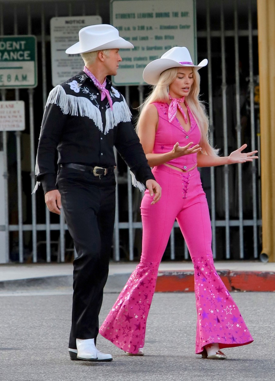 Egy korábbi szettet is lencsevégre kaptak, itt épp teljes cowboy-stílben nyomják, Gosling feketében, míg Robbie a Barbie ikonikus pink színét viseli.