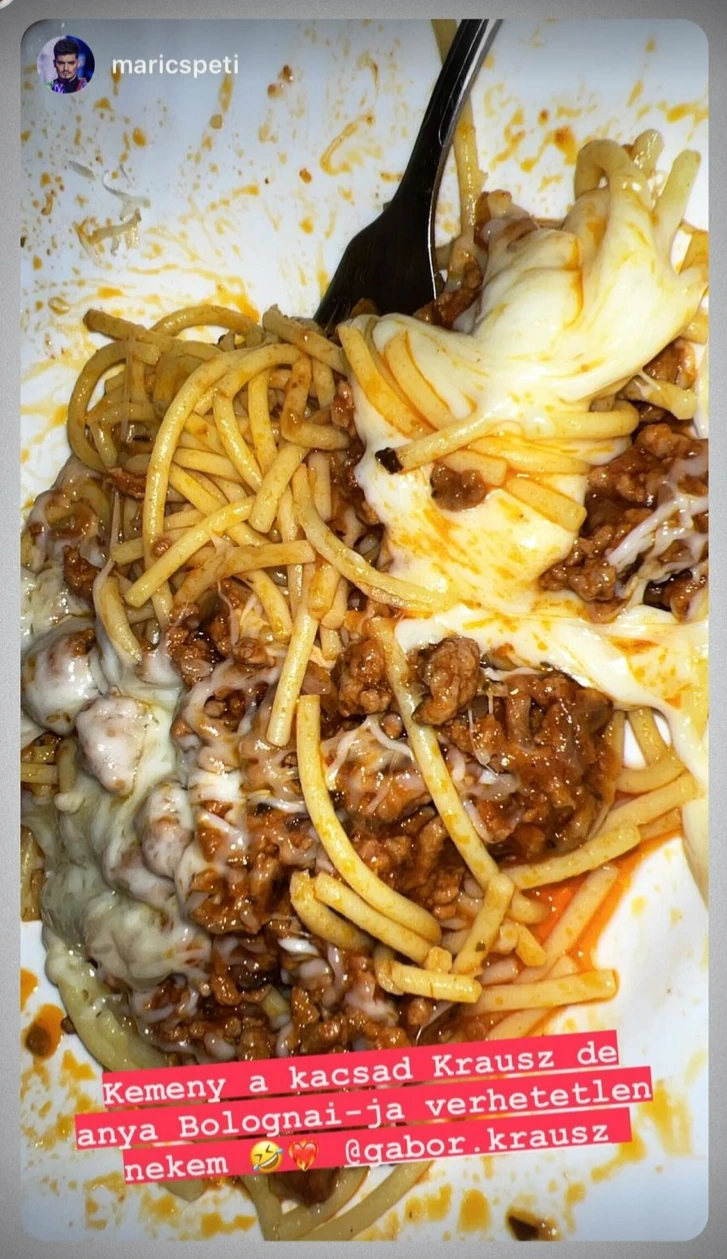 Kemény a kacsád Krausz, de anya bolognaija verhetetlen nekem - írta Marics Peti Instagram sztoriban. Az üzenetre Krausz Gábor csak annyit reagált, hogy megkóstolná a tésztát.