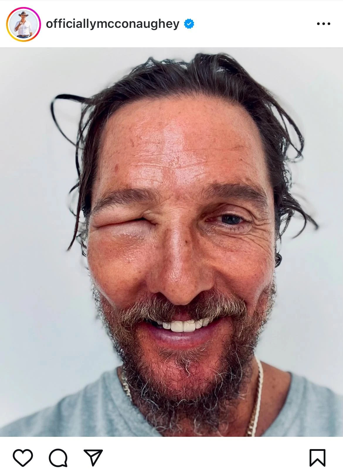 Matthew McConaughey valószínűleg sok rajongóját elborzasztotta legújabb Instagram-bejegyzésével, amelyen jobb szeme teljesen be van dagadva - ám ő a tőle megszokott széles mosollyal viseli az ijesztő szituációt.