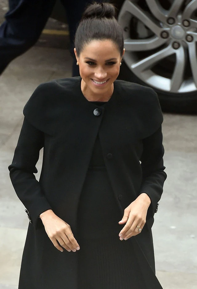 Meghan az eseménynek megfelelően elegáns öltözékben jelent meg, talpig feketében. A sötét szettet csupán krémszínű cipője dobta fel. Meghan ezt a Givenchy kabátot már korábban is viselte 2017-ben. A hercegné tökéletesen festett, viszont most nem ruhadarabjaival hívta fel magára a figyelmet, hanem frizurájával.