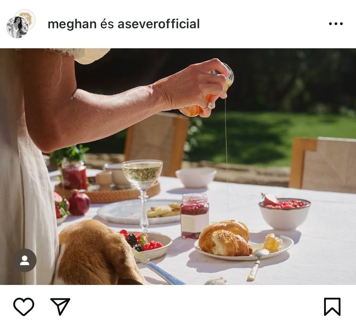 Nem sokkal a nagy bejelentés után Meghan elkezdett követni valakit az Instagramon, miközben korábban senkit sem követett - ezért is van nagy jelentősége a mozzanatnak, amit a HELLO szúrt ki. Talán nem meglepő módon az új fiók az új üzleti vállalkozásához kapcsolódik, hiszen az @aseverofficial a megújult arculatú As Ever márka oldala. Jelenleg még egyetlen poszt szerepel rajta (ami egyébként Meghan saját oldalán is): egy szabadban megterített asztal lekvárokkal, péksüteménnyel, gyümölcsökkel megrakva, a kompozíció közepén pedig egy női kéz - alighanem Meghané - épp mézet csorgat egy croissant-ra egy kutya társaságában.