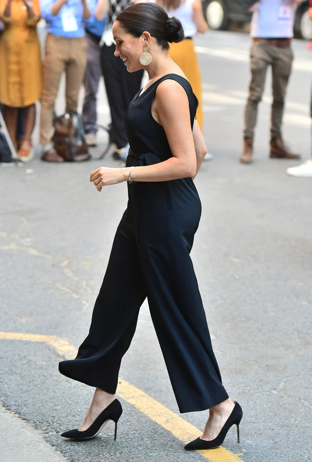 Meghan ismét nagyon vagány és nőies összeállítást választott. Fekete kezeslábast viselt, magas sarkú cipővel és hangsúlyos kiegészítőkkel! A hercegné ruháját kb. 35 ezer forintért beszerezheted, ha még nem kapkodták el a webshopból!