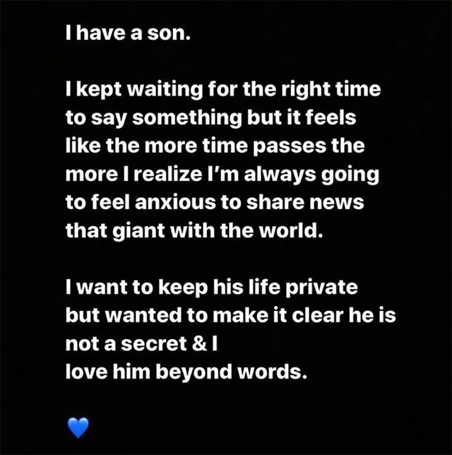 A napokban viszont Iggy Azalea saját maga posztolta Instagramon, hogy "van egy fia". A sztár azt is elárulta, hogy hiába várt a tökéletes pillanatra, hogy elújságolja, de minél tovább várt volna vele, annál jobban nyomasztotta volna a gondolat, hogy ekkora hírt kell nyilvánosságra hozzon. Továbbá azt is nyomatékosította, hogy szeretné a nyilvánosságtól távol tartani, de "nem titok, és mindennél jobban szereti".
