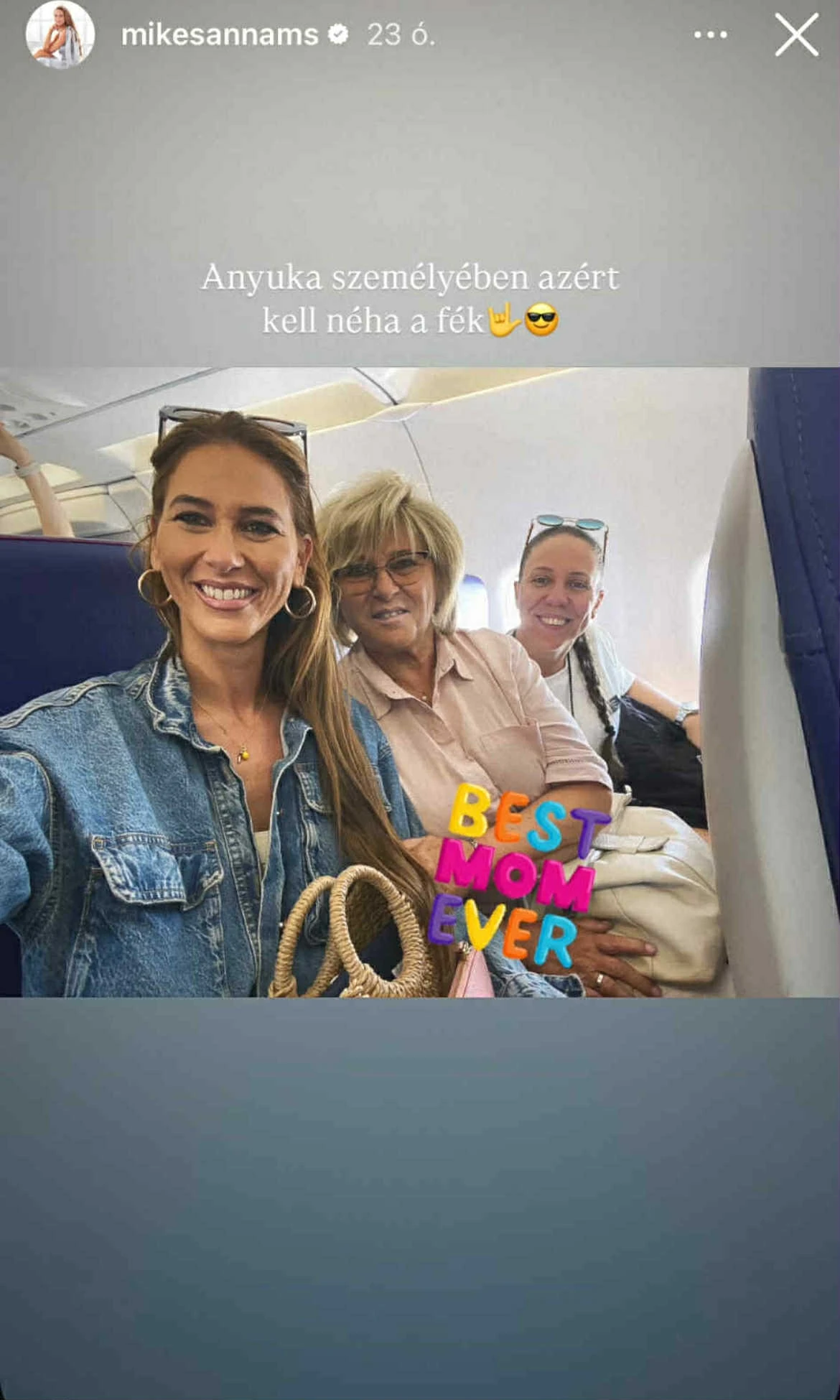 Mikes Anna az Instagram-történetében osztotta meg a repülőn készült közös fotót, amelyen édesanyjával és egy harmadik utastársukkal látható. A képhez ezt írta: „Anyuka személyében azért kell néha a fék”, a fotó alsó sarkában pedig a „BEST MOM EVER” (azaz: „a legjobb anyuka”) felirat díszeleg.
