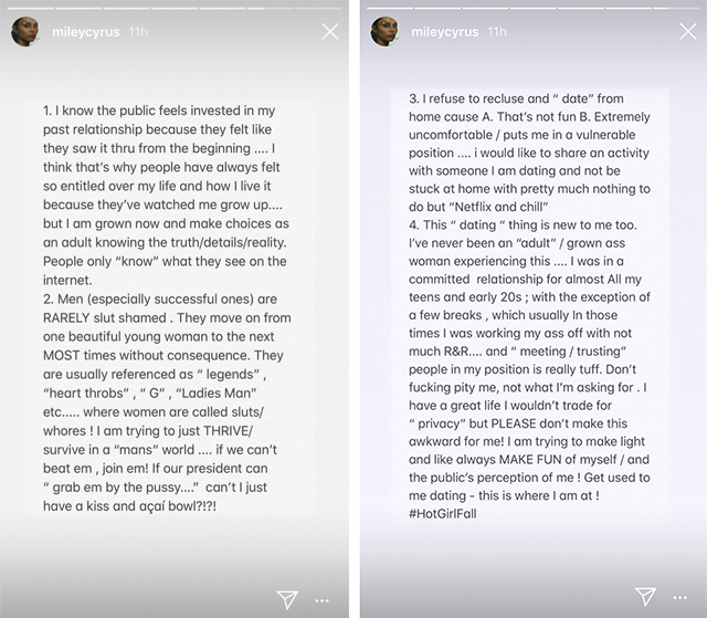 Cyrus azonban nem hagyta annyiban a dolgot, felháborodott levélben kérte ki magának, hogy azzal csókolózik, akivel csak akar, és ehhez senkinek semmi köze. Az üzenetben, amit Instagram Storyban posztolt arra is kitért, hogyha férfi lenne, akkor senki meg sem kérdőjelezné a viselkedését, vagy azt, hogy "falja" az újabb és újabb nőket és férfiakat, hanem "legenda" lenne a hozzá hasonló híres hollywoodi sztárok között.