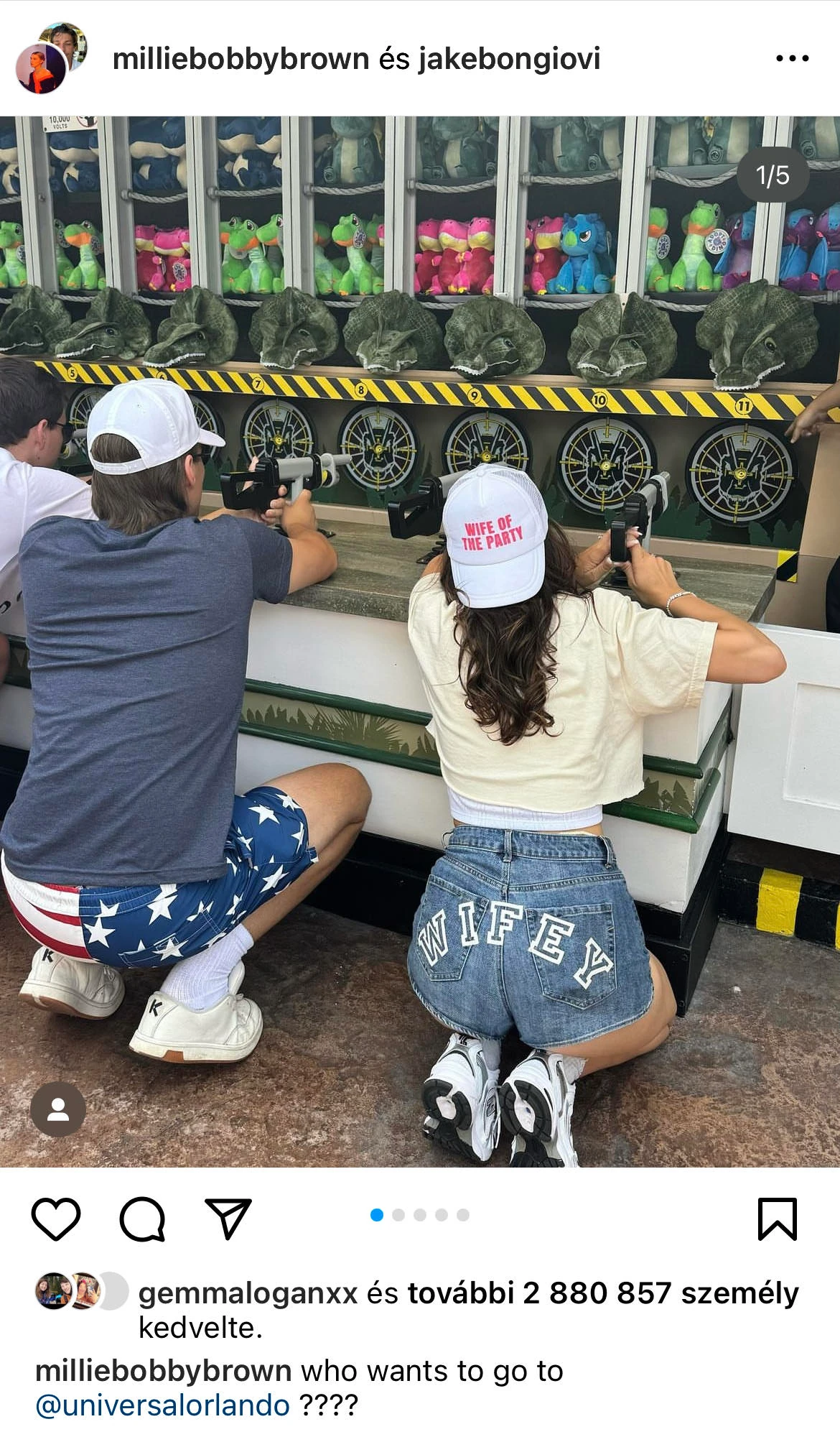 Tegnap Millie Bobby Brown egy fotósorozatot töltött fel, amin férjével felhőtlenül élvezik a napot az Universal Studioban. A képek egyikén hátulról láthatók, és nem lehet nem észrevenni a színésznő nadrágján és sapkáján lévő feliratokat: előbbin a "wifey", azaz a "feleség" angolul becézett változata, utóbbin pedig a "wife of the party" olvasható, ami annyit tesz: "a buli felesége".