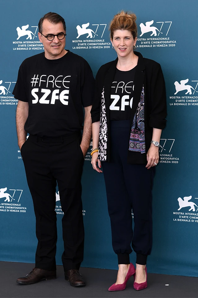 Az alkotók azonban a pólójukkal hívták fel még inkább a jelenlévők figyelmét, hiszen mindketten #FreeSZFE feliratú felsőben érkeztek a bemutatóra. A riporterek természetesen rákérdeztek a jelentésére, a rendező pedig részletezte a nemzetközi sajtó számára a budapesti Színház- és Filmművészeti Egyetem autonómiájának megfosztása körüli botrány tudnivalóit.