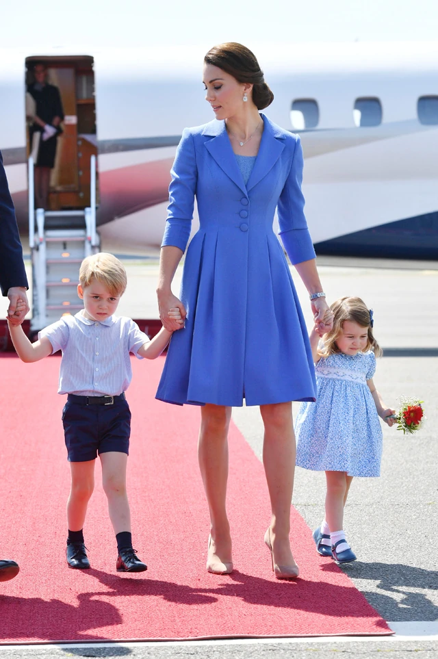 Úgy tűnik, Katalin hercegné és férje újabban a kék színt részesíti előnyben, ugyanis a mai napra az egész családot kékbe öltöztették. Kate egy gyönyörű királykék, elöl gombos egyberuhát választott, amihez férje egy azonos színű nyakkendőt viselt, és György herceget és Sarolta hercegnőt is a szín világos árnyalataiba öltöztettek fel. A kicsik éppen olyan elegánsak, mint szüleik, és igaz, kicsit fáradtnak tűntek az utazás után, ma is beragyogják a német repteret!