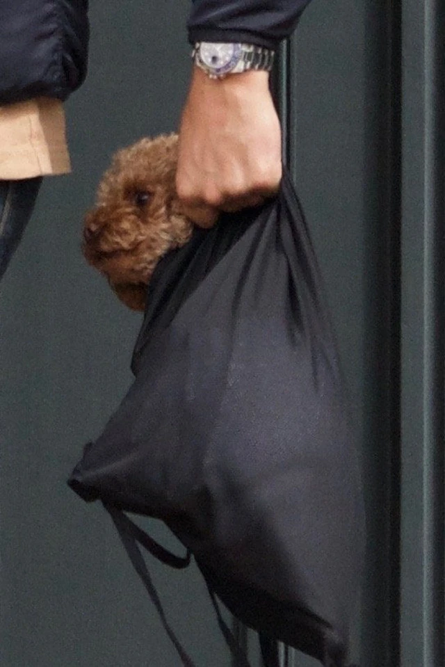 Ez már csak azért is volt meglepő, mert szerintünk sokkal kényelmesebb lett volna Mighty-nak egy kutyatáska, mint ez a tornazsák, amiből csak a feje lógott ki.