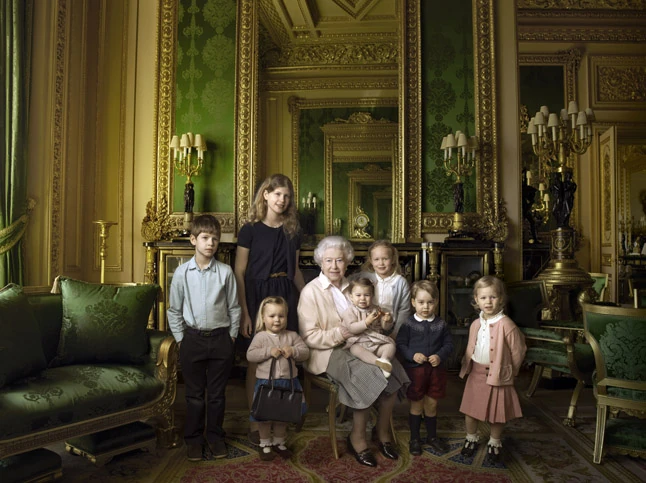 II. Erzsébet királynő a Buckingham Palota harmadik hivatalos portréján a királyi udvar legifjabb tagjaival, az unokái és dédunokái körében látható: James (8), Lady Louise (12), Wessex grófja és grófnője gyerekei, továbbá a kétéves Mia Tindall a királynő kézitáskájával a kezében, aki Zara és Mike Tindall kislánya, illetve Savannah (5), Isla Phillips (3), a királynő legidősebb fiúunokájának, Peter Phillipsnek és feleségének, Autumn-nak a gyermekei, valamint a kétvéges György és ölében a legfiatalabb csemete, a 11 hónapos Sarolta, akik ugyebár Vilmos herceg és Katalin hercegné gyerekei.