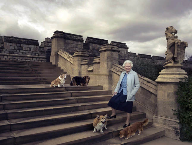 A kutyás fotón a négy kiskedvencével pózol a Buckingham Palota magánkertjének lépcsőjén, két corgija, Willow és Holly, illetve két dorgija, Vulcan és Candy társaságában.