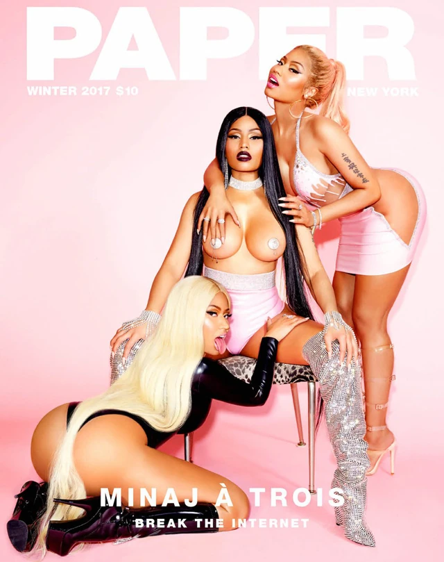Eddig, mert most Nicki Minaj címlap tényleg erős lett. A szintén nem túl szégyenlős popsztár, aki akár egy vörös szőnyeges eseményen is szégyenérzet nélkül mutogatja a kebleit, egy fotózáson még inkább megszabadul a gátlásaitól. A Paper címlapján eleve alig van rajta ruha, de az igazán meglepő, hogy az egyik Nicki a középen ülő mellét fogdossa, míg a térdel Nicki orális szexet imitál a középsővel. Hogy mit akar ez jelenteni, azt firtatni is felesleges, mindenesetre vizuálisan szinte sokkoló.