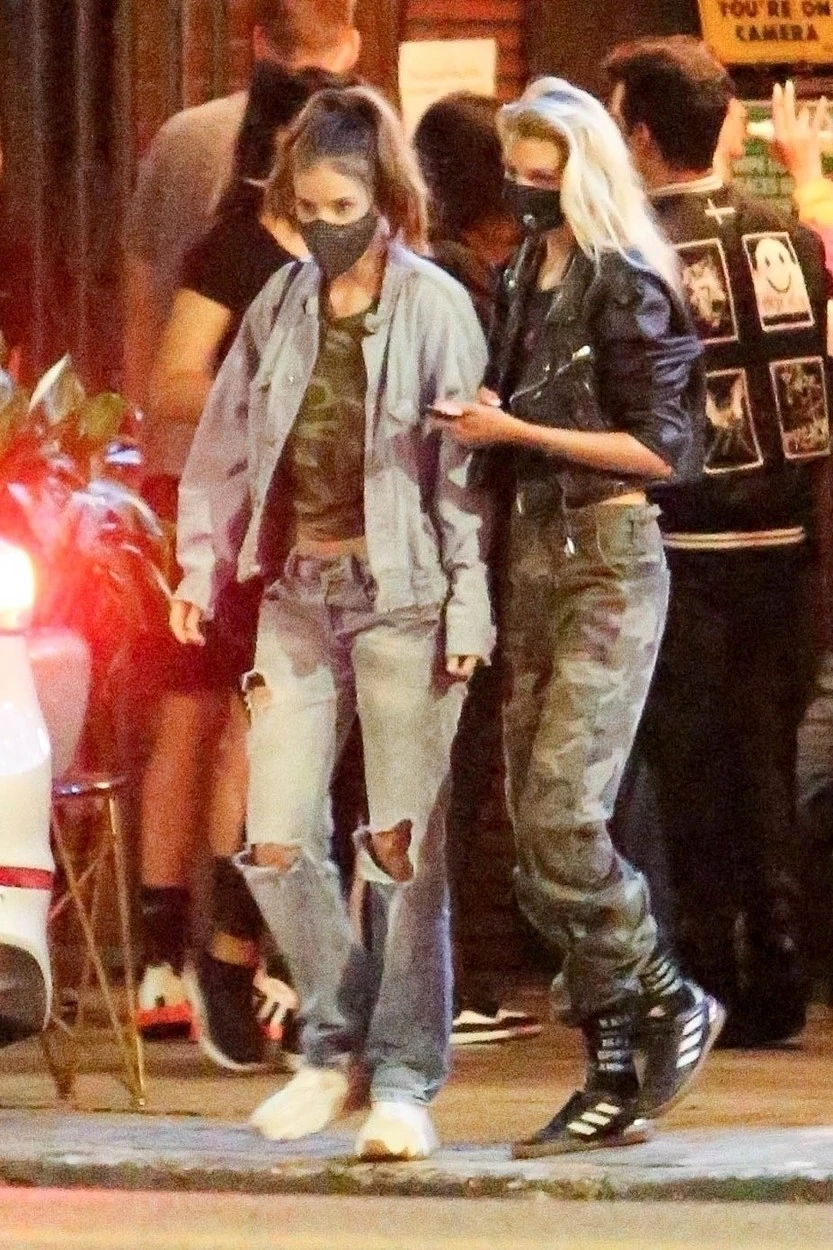 A magyar topmodell vagány, szakadt boyfriend farmert, military mintás pólót és farmerdzsekit viselt, a haját pedig magas lófarokba kötötte. A maszk sem hiányzott természetesen az arcáról.