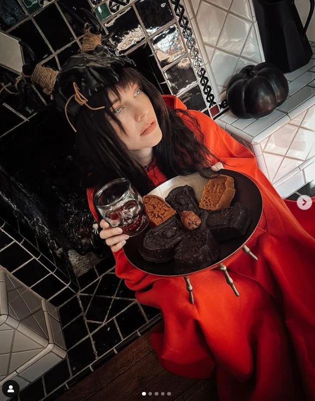 A fotósorozaton a modell egy narancssárga köpenyt, frufrus parókát és egy ijesztő maszkot visel, miközben sírkő alakú süteményeket és egy koponyás poharat tart a kezében. Egyszerre félelmetes és zseniális, alig lehet ráismerni!