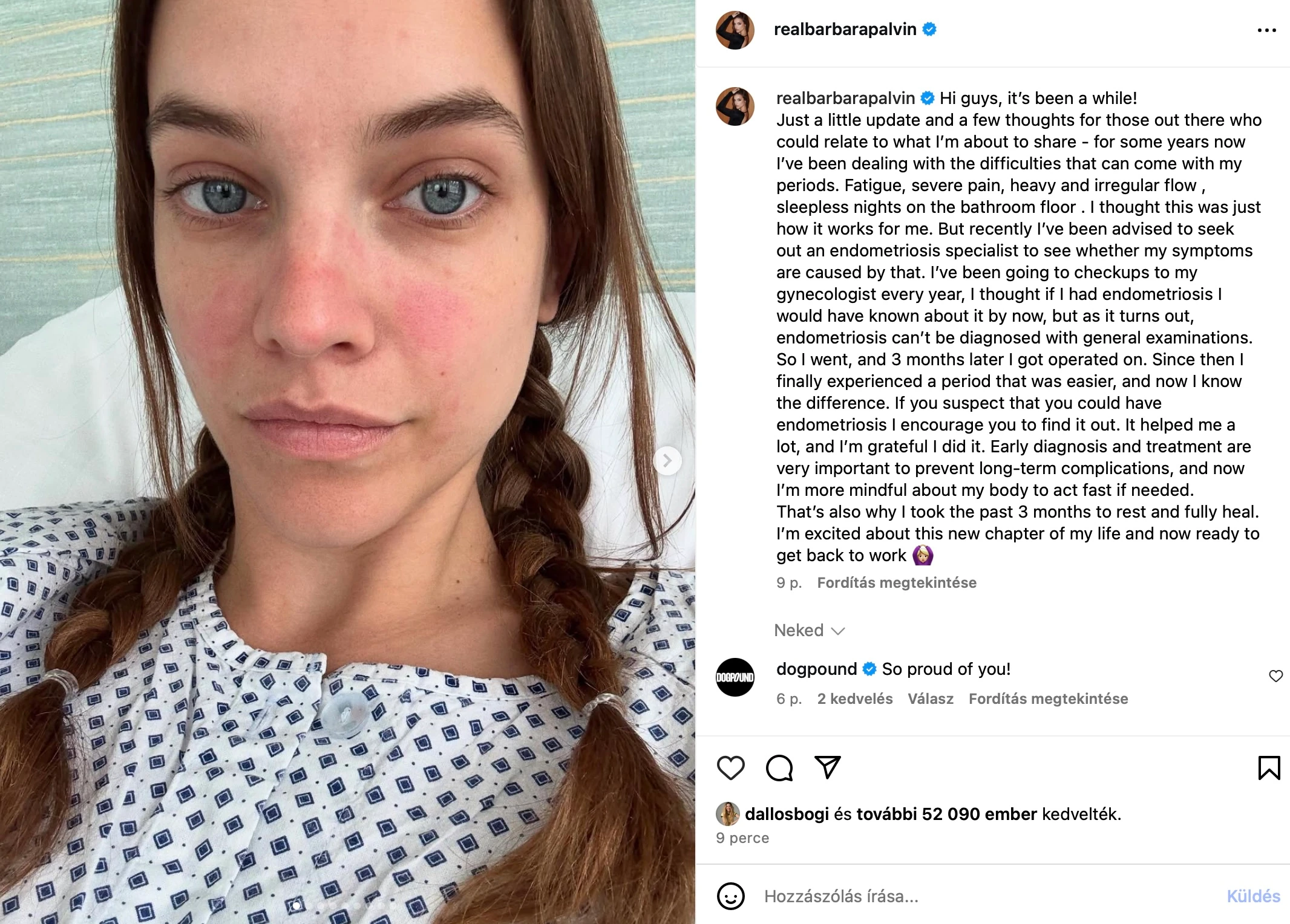 „Azóta végre nem szenvedem meg annyira a menstruációt, és most már pontosan érzem a különbséget. Ha azt gyanítod, hogy endometriózisod van, arra biztatlak, hogy járj utána. Nekem nagyon sokat segített, és hálás vagyok, hogy megléptem. A korai diagnózis és kezelés nagyon fontos a hosszú távú szövődmények megelőzése érdekében, és most jobban odafigyelek a testemre, hogy szükség esetén gyorsan cselekedhessek” - fogalmazott a bejegyzésében, majd hozzátette, készen áll arra, hogy visszatérjen a munkába.