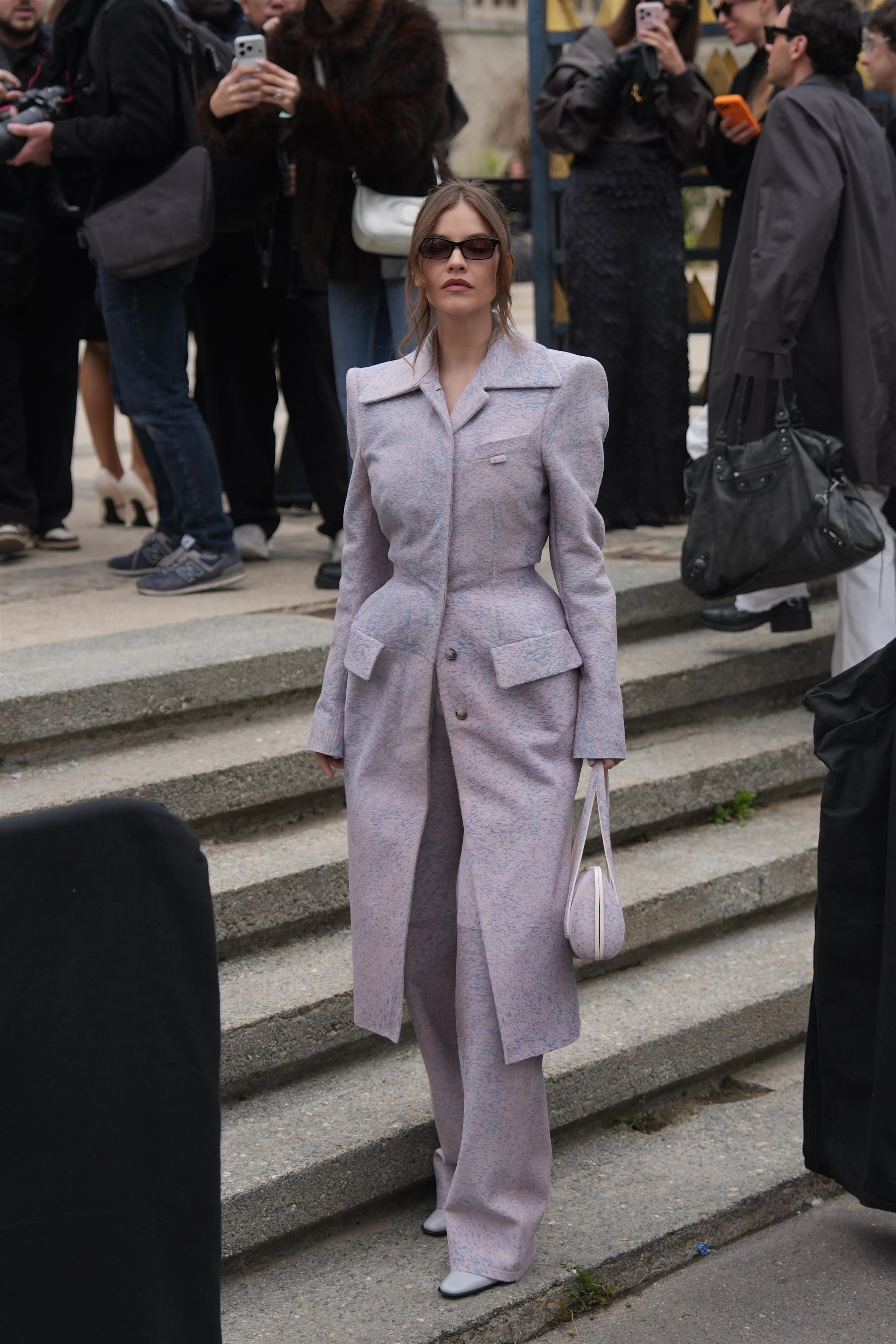 A modell egy levendulalila és halványkék pöttyökkel tarkított, válltöméses, hosszú kabátban és hozzá passzoló, bő szárú nadrágban tűnt fel, amit a szettjéhez illő táskával, fehér bőr magassarkúval, valamint fekete napszemüveggel egészített ki. A megjelenése nagyon egyszerű és letisztult volt, a kabát strukturált szabásvonalának köszönhetően mégis különleges. Az pedig már csak hab volt a tortán, hogy tökéletesen kihangsúlyozta Barbi alakját.
