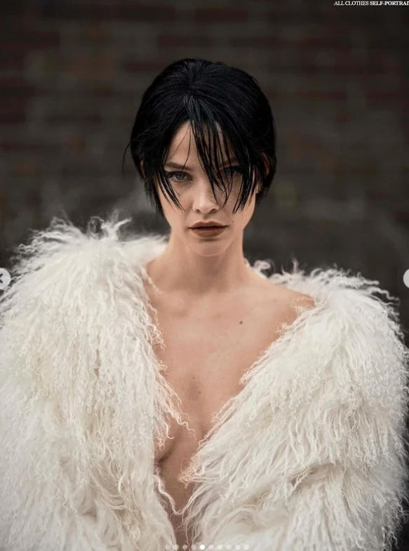 A képek másik felén pedig szintén rövid, fekete tincsekkel láthatjuk, de ezúttal frufru nélkül. Az pedig csak a hab a tortán, hogy a hajátalakulás mellett azt is bevállalta, hogy felső és melltartó nélkül pózoljon egy elől nyitott szőrmekabátban.