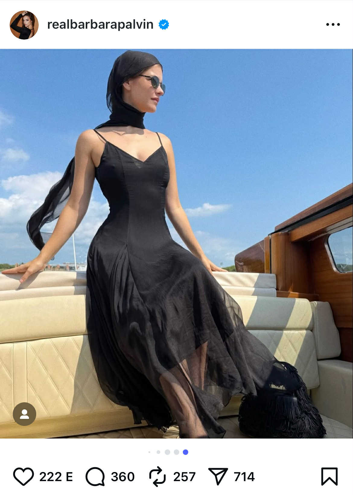 A képeken Barbara egy fekete selyem- és sifonruhában, a Nana Jacqueline Irena Dress modelljében látható. A darab egyszerre klasszikus és modern, a finom, masnival ellátott pántok és a lágyan omló, A-vonalú szoknyarész pedig tökéletesen érvényesül a szélben, miközben a haját és nyakát egy légiesen könnyű fekete kendő keretezi. A visszafogott, mégis drámai hatású összeállítás igazi mediterrán hangulatot idéz, és mintha egy régi olasz film jelenetéből lépett volna elő.