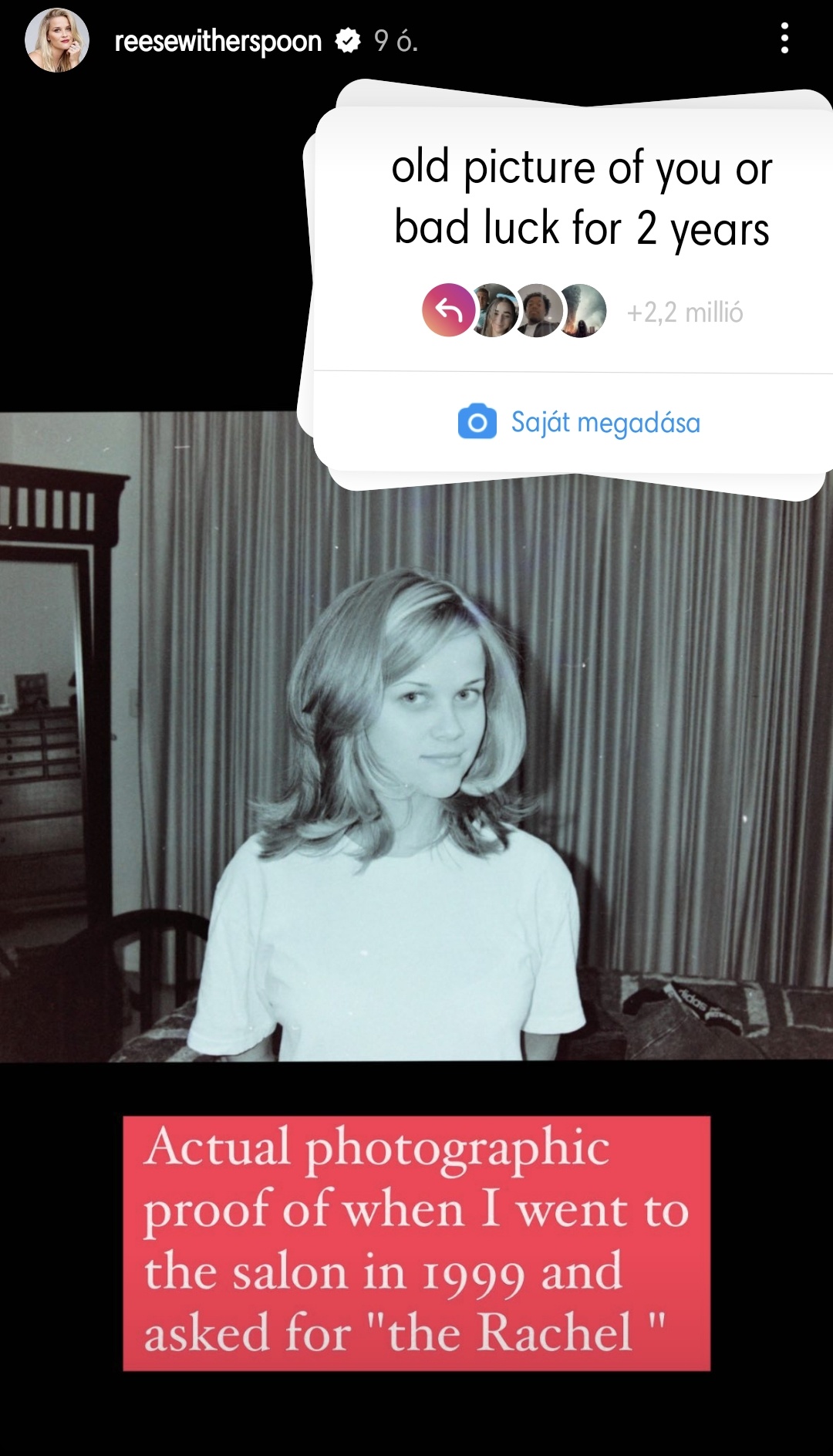 Reese Witherspoon Instagram történetében ma megosztott magáról egy fotót, amely egészen 1999-ig nyúlik vissza. Egy rajongó kérésének tett eleget azzal, hogy kitette ezt a nosztalgikus képet az alábbi felirattal: „Kézzelfogható bizonyíték arról a napról, amikor elmentem a fodrászhoz és a Jóbarátok tipikus „Rachel-frizuráját” kértem”. Reese nagyszerű döntést hozott, hiszen egyszerűen fantasztikusan állt neki!