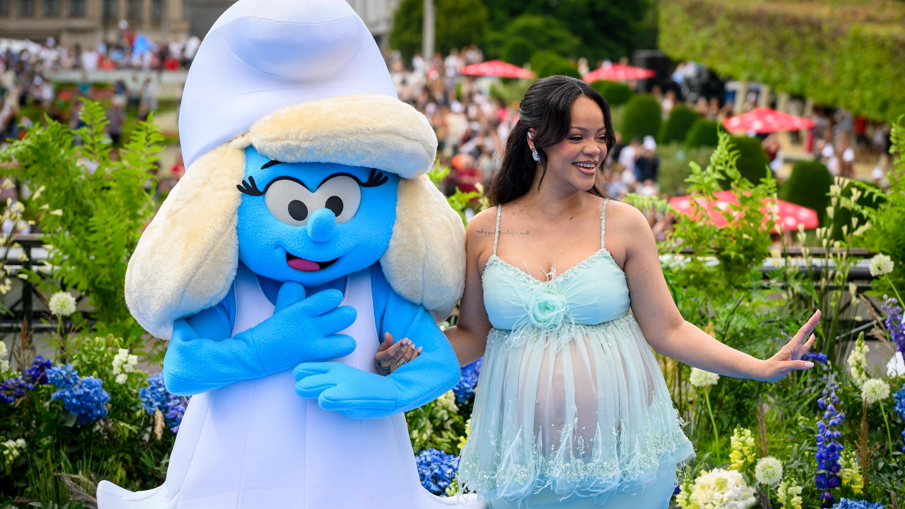 Június 28-án, Brüsszelben került sor a Hupikék törpikék világpremierjére, ahol Rihanna Törpilla hangjaként mutatkozott be. A bemutatóra párjával, A$AP Rockyval érkezett, és minden szempár rájuk szegeződött – különösen Rihanna Chanel szettjére. A kék, áttetsző babydoll felső rózsadíszítéssel és tollas szegéllyel finom eleganciát sugallt, amit a hozzá illő hosszú szoknya és szaténmagassarkú tökéletesen kiegészített.
