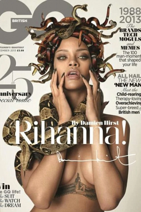 A sorozat a medúza mitológiai témáját jeleníti meg, eszerint Riri a világ végén tanyázó alakot testesíti meg, akinek a tekintete kövé dermeszti, aki ránéz. A régi görög úgy tartották, hogy a fején kígyók tekergőznek, szerencsére Hirst feldolgozása eltekintett a vadkanéhoz hasonló agyaraktól, mert valljuk meg őszintén Rihanna így is elég fenyegetően néz le ránk a GQ ünnepi számáról.