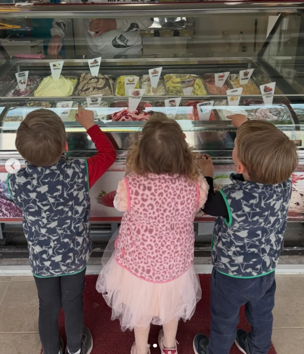 Úgy tűnik, a család az énekesnő szülőfalujában, a vajdasági Kishegyesen járt, ahol a négyéves hármasikrek jutalmul fagylaltot is kaptak. Lujza, Keve és Zalán maga választotta ki az ízeket, a fotókon jól látszik, amint a pult finomságai között nézelődnek.