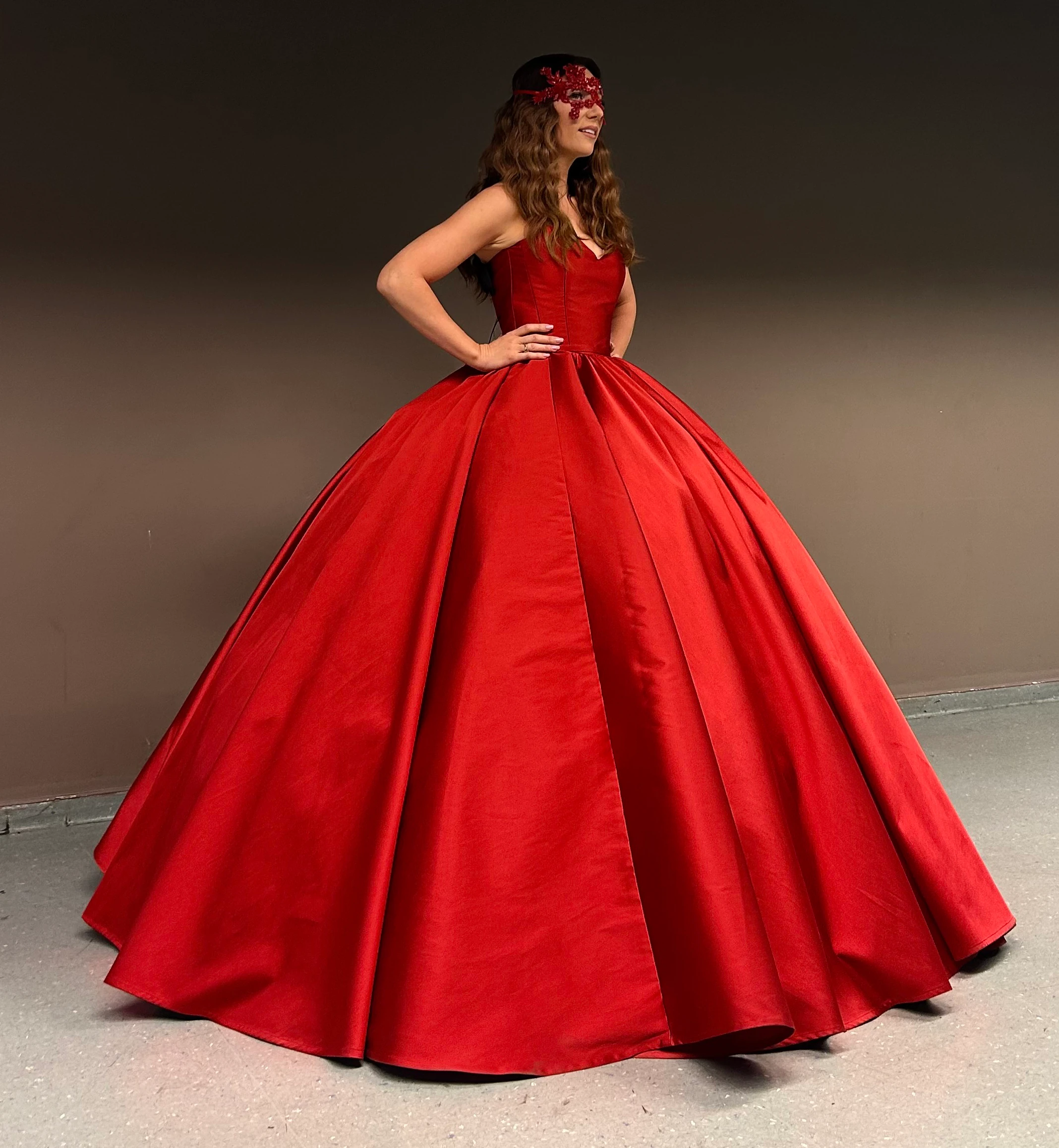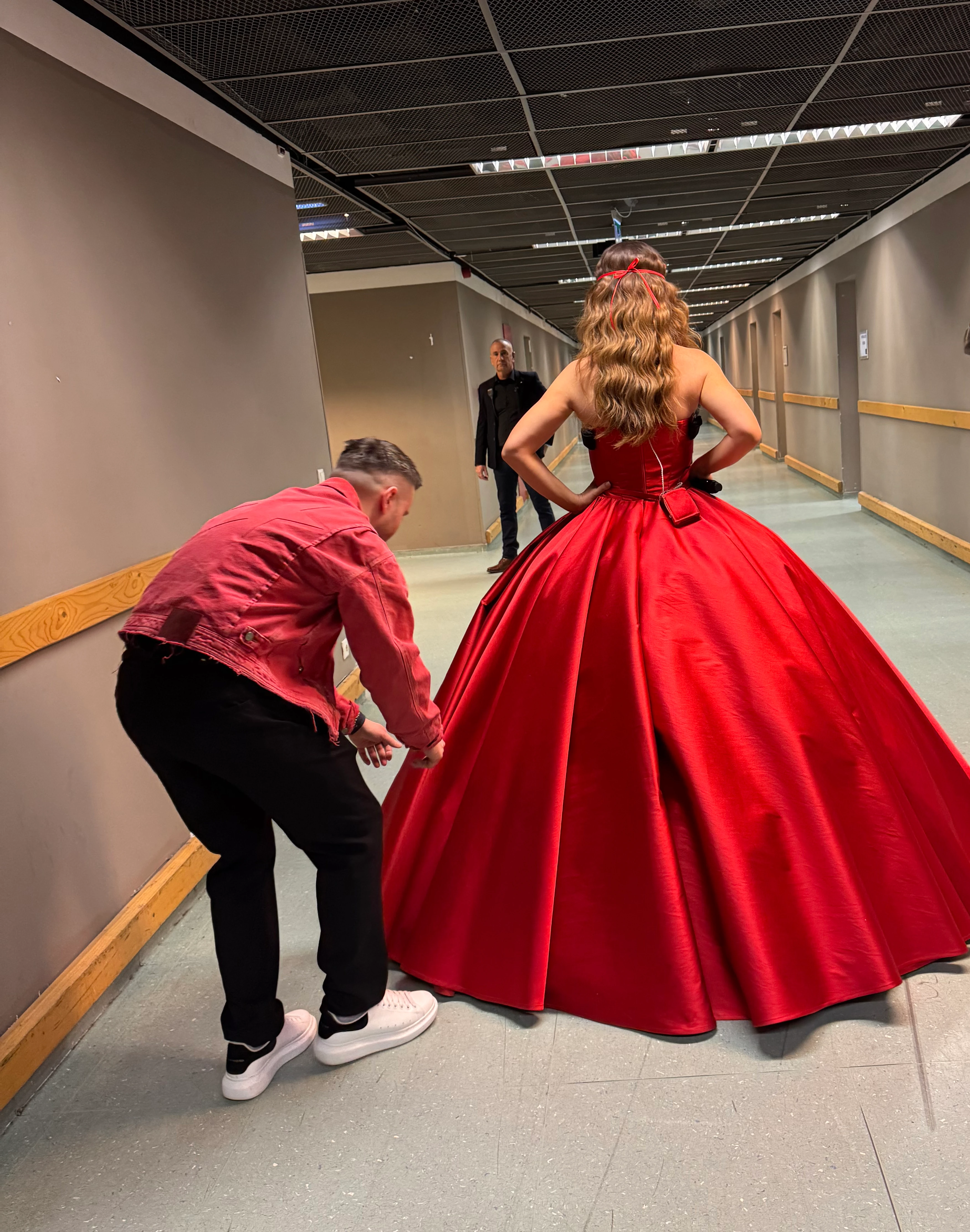 „Számomra Magdi az egyik leginspirálóbb női előadó Magyarországon, és mindig hatalmas öröm, amikor egy új ruhakölteményt álmodhatok meg számára. Egészen egyedi víziója van a színpadi megjelenésről, ezért is javasolta, hogy hozzunk létre egy igazán drámai, nagy piros báliruhát. Alapvetően klasszikus, derékhangsúlyos szabást választottam, amit a fűző fazon és a pánt nélküli kialakítás még elegánsabbá tesz, gyönyörűen kiemelve Magdi vállait és dekoltázsát.