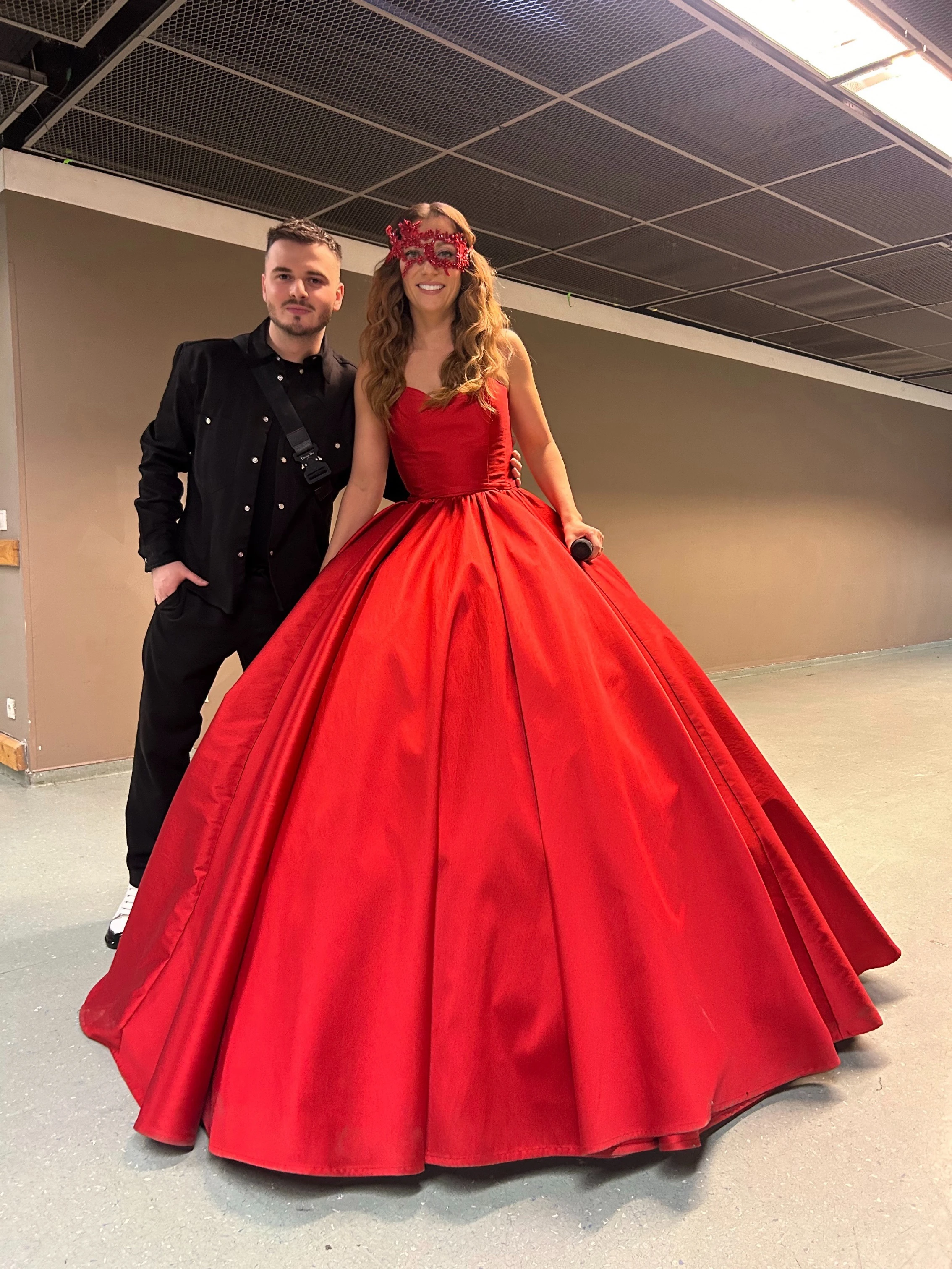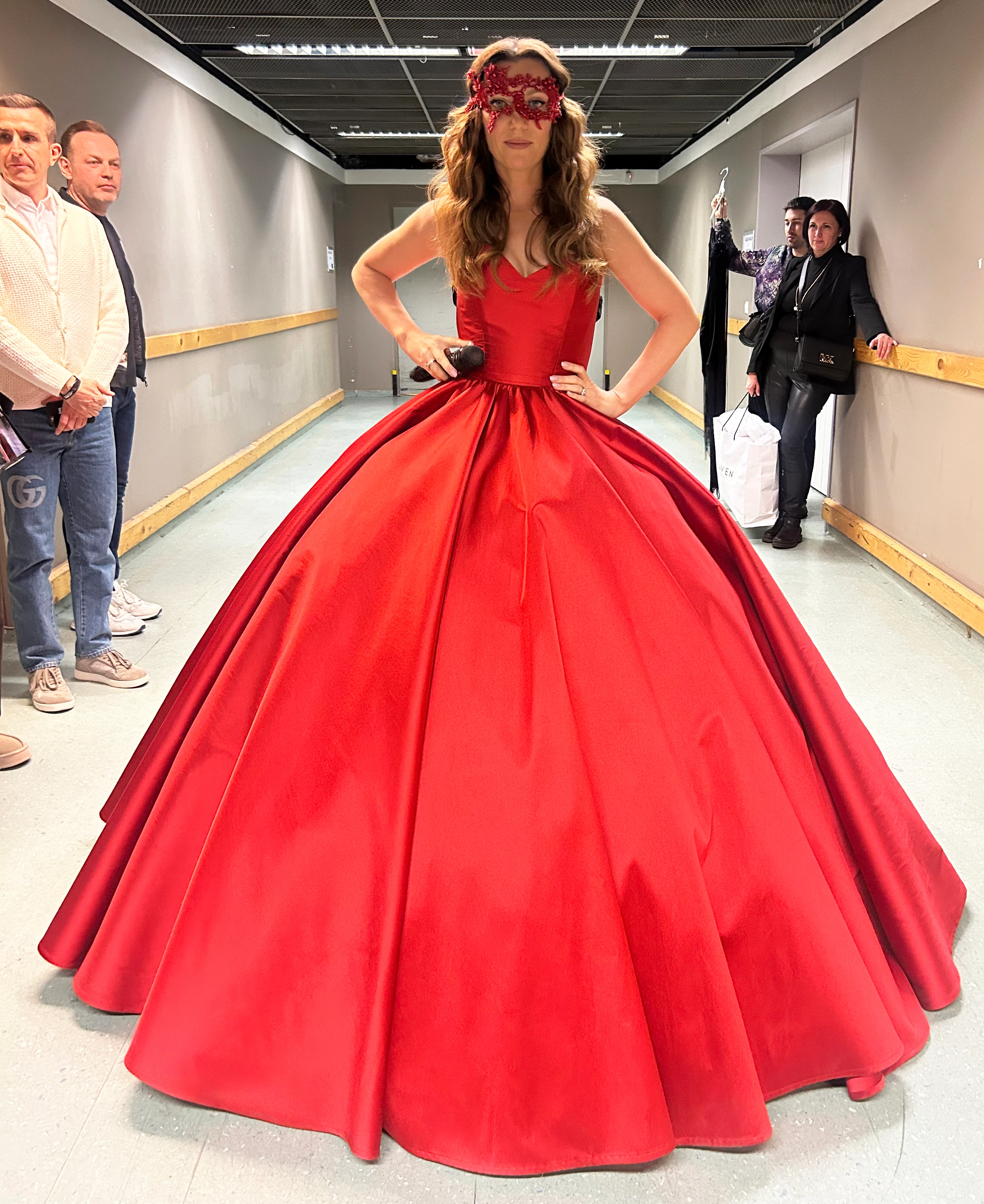 A Demeter Richárd által tervezett, élénkvörös, földig érő estélyi ruha egyszerre idézi a klasszikus báli hangulatot és a modern eleganciát. A felsőrész testhez simuló szabása kiemeli az énekesnő alakját, miközben a szoknya drámai volumenével és körbefutó szabásával valódi hercegnős megjelenést kölcsönöz. A ruha intenzív színe remekül érvényesül a színpadon, a hozzá passzoló maszk pedig tovább fokozza a titokzatosságot és a show-elemet. Az anyagválasztás és a szabás minden részlete gondos tervezésről árulkodik, így az összhatás nemcsak figyelemfelkeltő, hanem kifejezetten kifinomult és emlékezetes is.