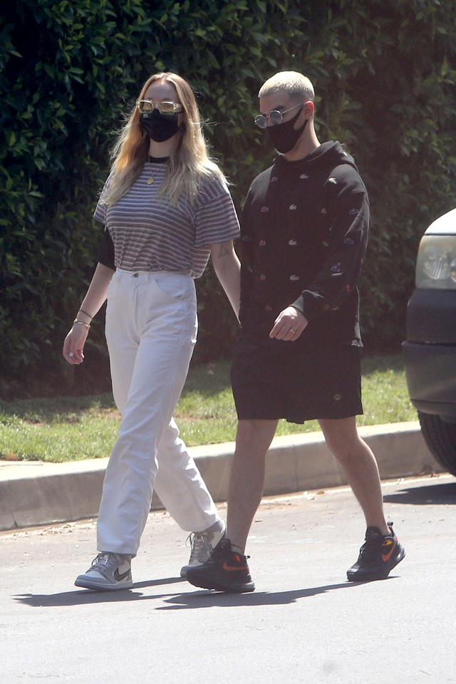 Bár nyilvánvalóan nem sok mindent látni így, de szerintünk Sophie igen jól néz ki. Egy fehér nadrágot és csíkos felsőt viselt a Trónok harca sztárja, míg Joe Jonas egy fekete szettet választott.