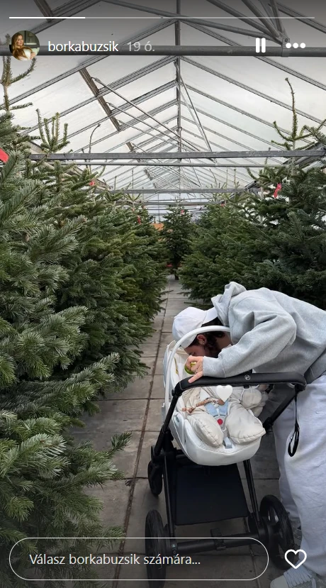 A fotón azt az édes pillanatot örökítette meg Borka, amikor az édesapa egy puszit nyom a babakocsiban fekvő pici arcára. A pár már javában hangolódik a karácsonyra, és úgy tűnik, hogy a fenyőfa kiválasztása is folyamatban van, ugyanis egy fenyőfavásárra látogatott el a kis család.