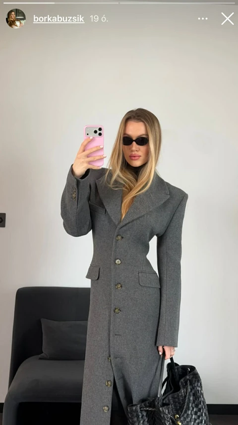 A hangsúlyos válltöméses, karcsúsított szabású, térd alá érő szürke kabátruhában Buzsik Borka igazi modern nagyvárosi ikon benyomását kelti. A strukturált szabás gyönyörűen kiemeli az alakját, miközben megőrzi a klasszikus elegancia vonalát.