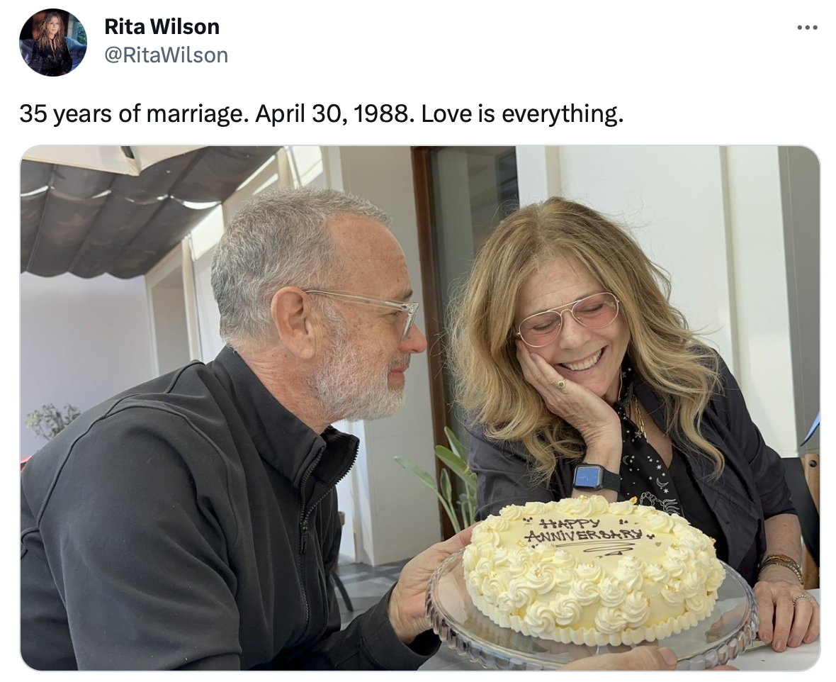 35 év rengeteg idő, különösen akkor, ha házasságról van szó. A szarvilágban pedig pláne kevés házasságot találsz, ami ilyen régóta tart: Tom Hanks és Rita Wilson szerelme viszont épp közéjük tartozik.