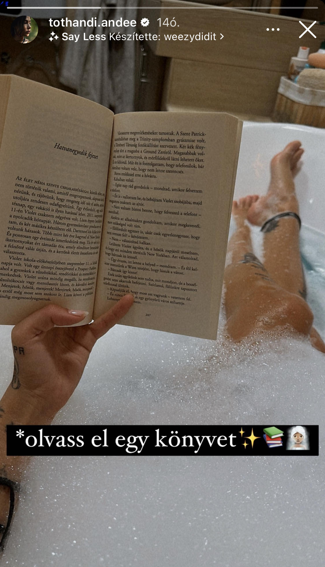 Tóth Andi legjobb barátja az ősz. Ennek apropóján összeállított egy őszi bakancslistát, a lista pontjainak teljesítését napról napra megosztja követőivel. Most éppen egy jó könyvvel kuckózott be az őszi hűvös elől - kellemest a hasznossal, ezt egy forró habfürdőben merülve tette meg.