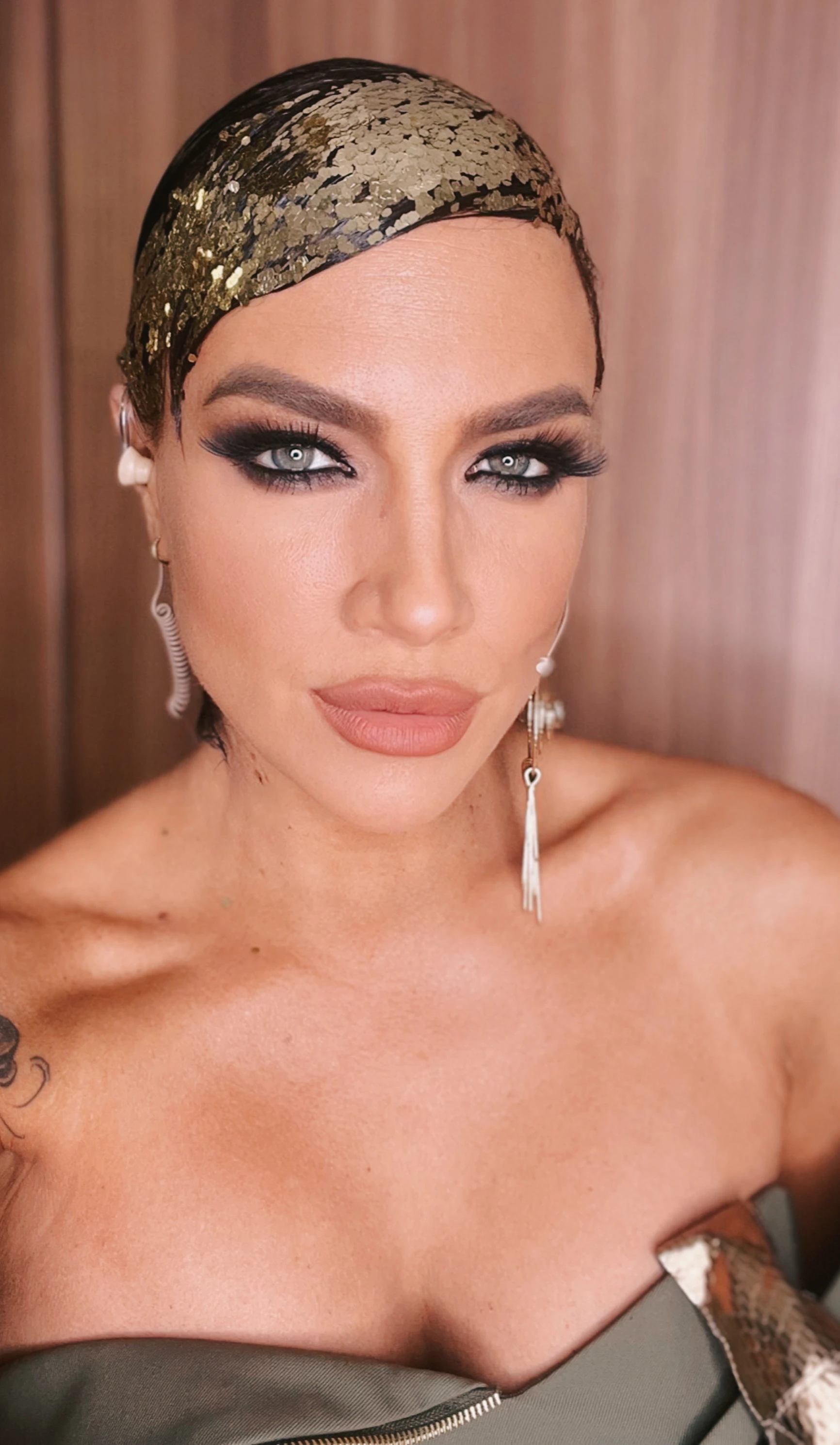 Gabi hajára ezúttal arany glitter került, ami csodásan harmonizál a ruháján lévő, védő kígyómotívummal. Sári Kata fodrász mindig a fej formáját követve fésüli le a haját, mert Gabinak különlegesen szép fejformája van. A sminkje egy klasszikus füstös szemfestés lett, amibe Jónás Kata sztársminkes belecsempészett a szemhéj mozgópontjára egy finom szemcsézettségű csillámport is. Mivel a szem intenzív, a száj ezúttal naturális maradt.