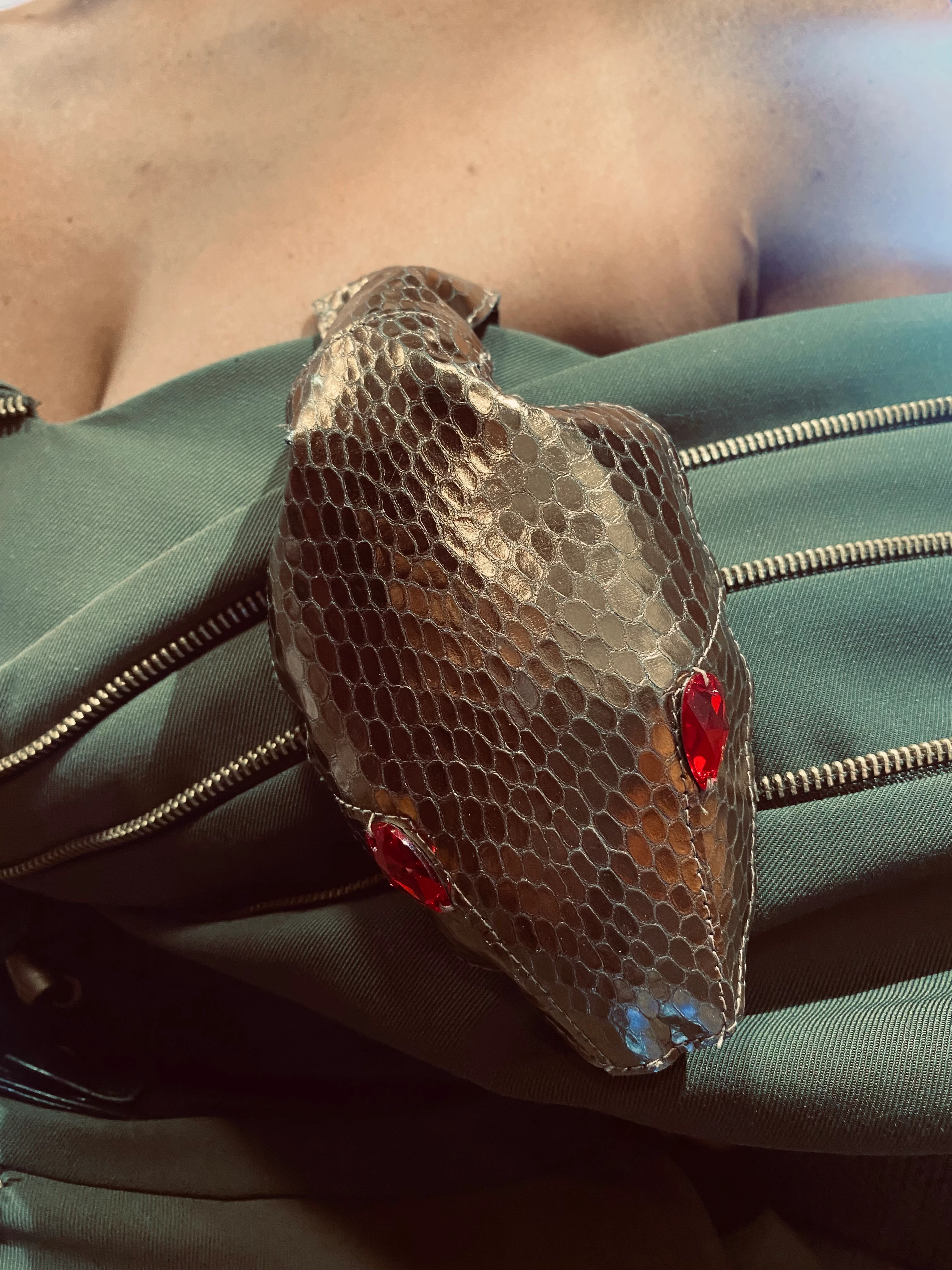 Arról kérdeztem Kazal Vikit, hogy miért választottak egy ilyen rizikós állatot inspirációul és motívumként, mint a kígyó. Arról már előljáróban is tájékoztatott a stylist, hogy Tóth Gabi minden egyes ruhájának nagyon komoly háttere, mondanivalója lesz, de ezen azért meglepődtem.