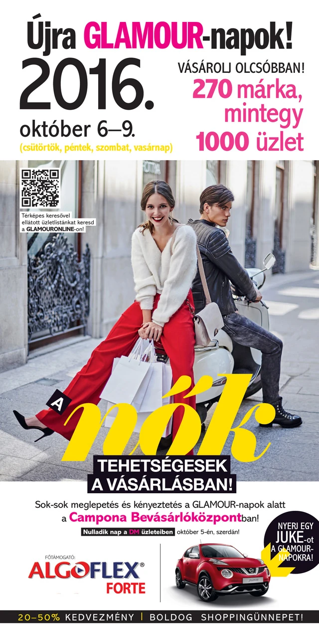 Igen, hamarosan újra itt van a Shoppingünnep! Október 6. és 9. között újra GLAMOUR-napok, amikor a magazin mellé csomagolt kuponfüzettel mintegy 270 márka termékeiből vásárolhatsz 20% vagy akár 50% kedvezménnyel. Te már azt is tudod, hogy már jó ideje nem csupán arról van szó, hogy felfrissítheted a ruhatáradat a következő szezonra, hiszen a szórakozástól a háztartásig rengeteg területen nyújt neked kedvezményt a GLAMOUR. Szóval, irány az újságos, elő az ollókat, és kezdjétek meg a módszeres felkészülést a GLAMOUR-napokra. Ne feledjétek, ezúttal is nyerhettek 100 ezer forint költőpénzt, és még sok izgalmas nyeremény vár (mobiltelefon, hétvégi pihenés bortúrával, csodás ékszerek), ha velünk játszotok!