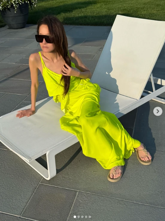 A fotókon egy neonsárga, hátul kivágott nyári ruhában pózol a medence partján, amit szandállal és egy nagy, fekete napszemüveggel koronázott meg, miközben hosszú haja lágyan a vállára omlik.