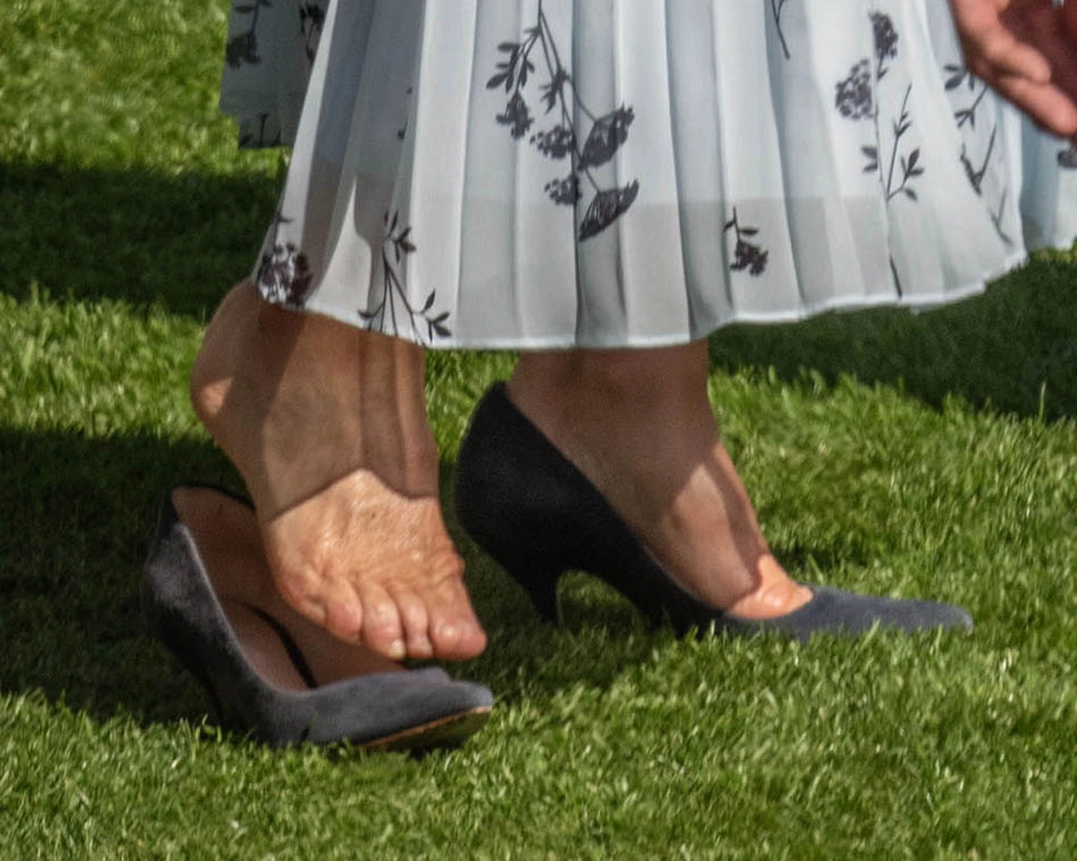 Katalin hercegné édesanyja a virágos ruhájához egy színben passzoló, nem túl magas, de mégis tűsarkú cipőt választott, amiről pontosan tudja mindenki, aki viselt már ilyet, hogy pont úgy süllyed el a füves talajban, mint mikor sátrazni megy az ember, és leszúrja a sátorszöget. Carole is így járt, Vilmos herceg vette észre, hogy bajban van, és azonnal a segítségére sietett.