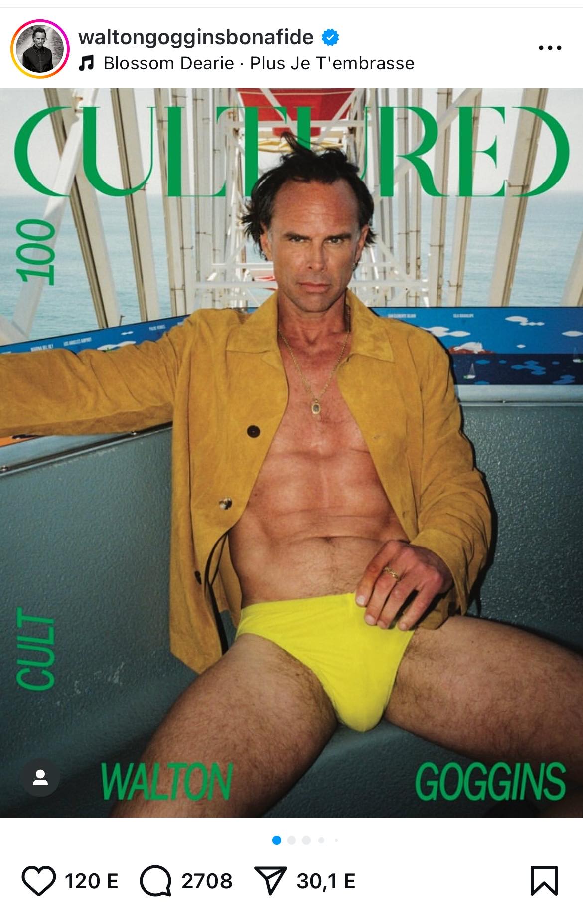 Azonban hírnevének nemrég újabb löketet adott A Fehér Lótusz harmadik évada, ahol a kicsit sem egyszerű Rick Hatchett karakterét alakította, most pedig bebizonyította azt is, hogy címlapsztárként sem riad vissza a merész választásoktól. A Cultured fotózása során Walton Goggins az élénksárga fürdőnadrágon kívül csupán egy barna Zegna velúrkabátot és saját ékszereit viselte, a kicsit sem szokványos szettet pedig cowboycsizmával egészítette ki.