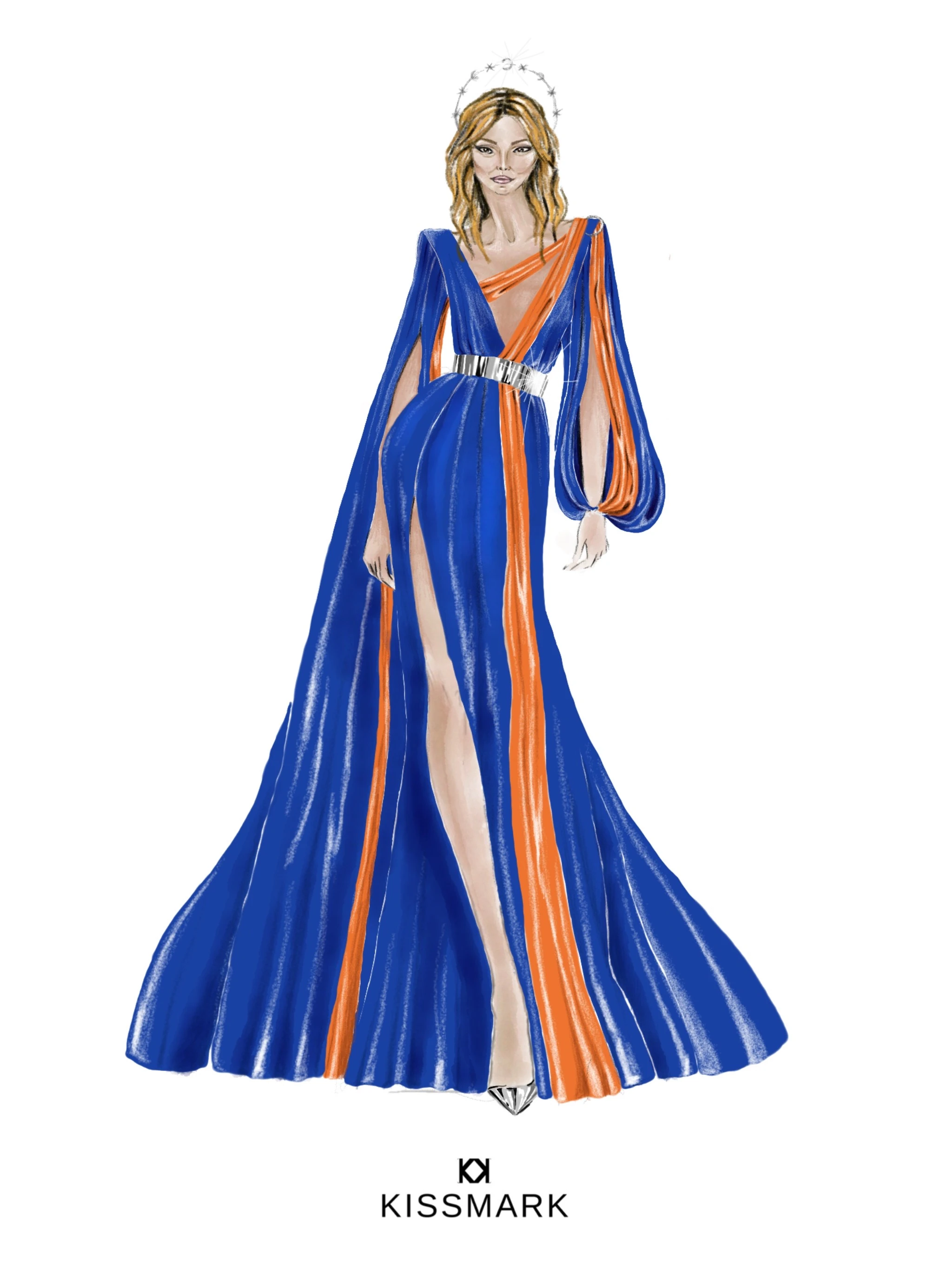 Formailag a ruha klasszikus és könnyed: elöl-hátul V-dekoltázzsal, földig érő, enyhén sellős uszállyal. Az egyik ujj lágyan omlott a földig, palásthatást keltve, míg a másik buggyos drapériával futott a csuklóig, amelyet apró, szikrázó csillagok díszítettek. Az asszimmetrikus narancs betétek játékosan törték meg a kék dominanciáját, lendületet és éteri hatást kölcsönözve az egész megjelenésnek.