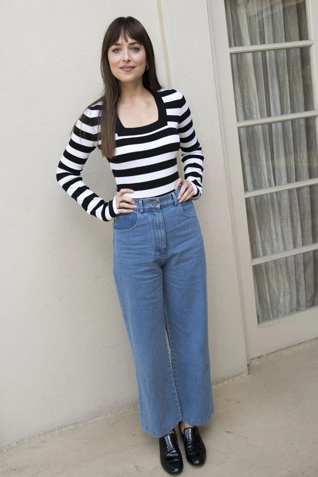 Az általa választott szélesszárú farmernadrág a 2019-es resort kollekció darabja, ami december 1-től lesz elérhető online és az üzletekben. Dakota Johnson a farmernadrágot egy fekete-fehér csíkos pulcsival és fekete lakkcipővel párosította, a szettet pedig új filmjének, a Sóhajoknak a sajtótájékoztatóján viselte Beverly Hillsben október 24-én.