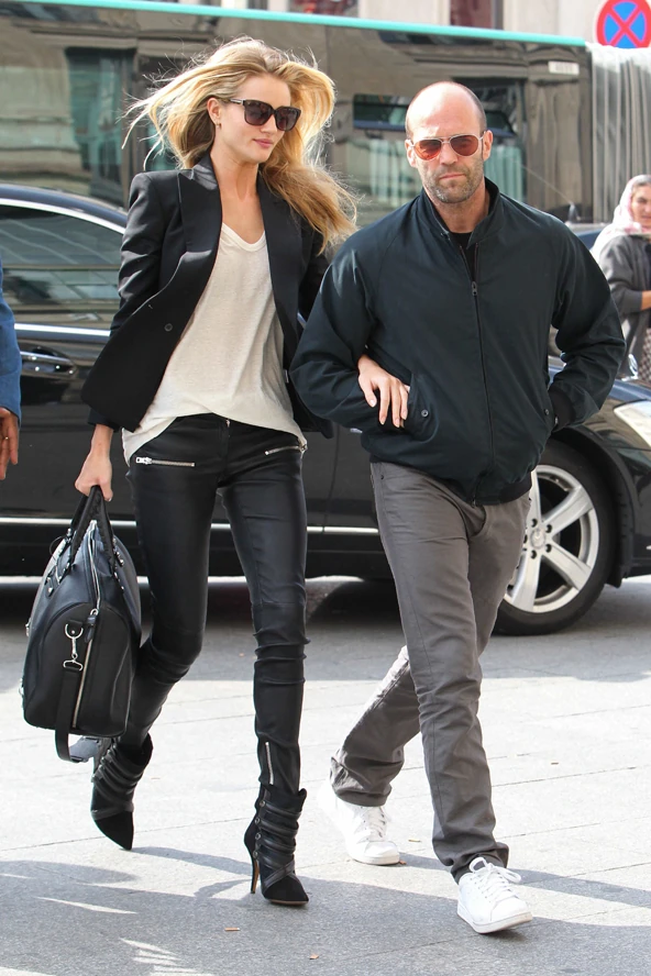 A szépséges, hosszúlábú modell/színésznő vagány bőrnadrágba, fehér pólóba és fekete blézerbe öltözött, magas sarkú csizmájában bőven a sportos szettben levő akciósztár fölé emelkedett. Mióta együtt vannak, Rosie Huntington-Whiteley általában kerüli a nagyon magas cipők viselését, főleg a közös vörös szőnyeges megjelenések alkalmával. De a divat hazájában, ahol amúgy is most Fashion Week tombol, a modell mégsem járhat holmi lapos talpúban. Szerinted összeillik a szőkeség és Jason Statham?